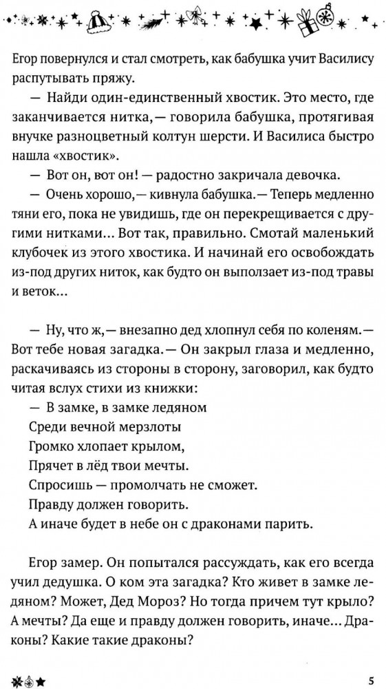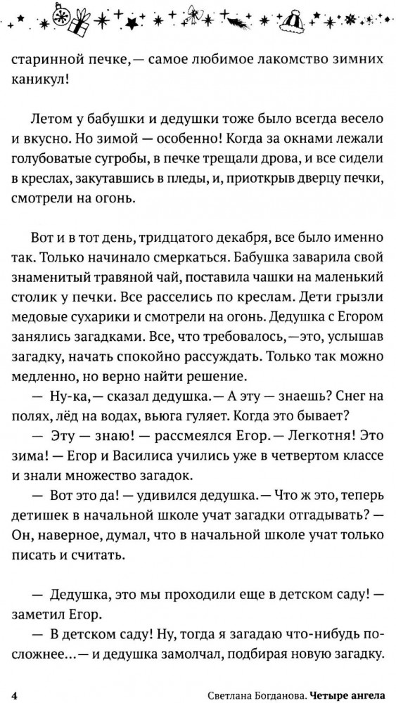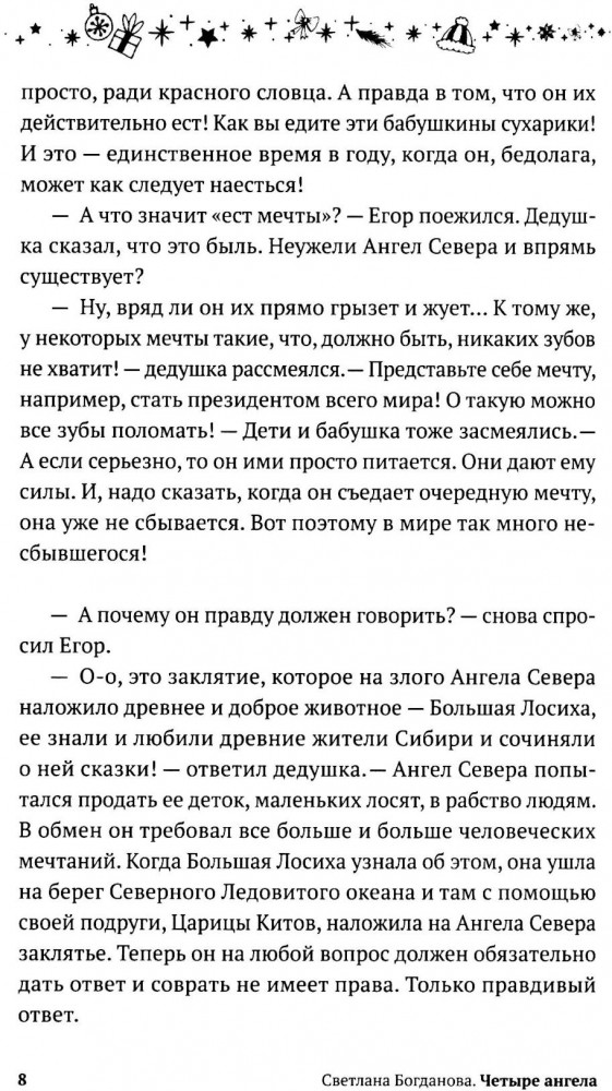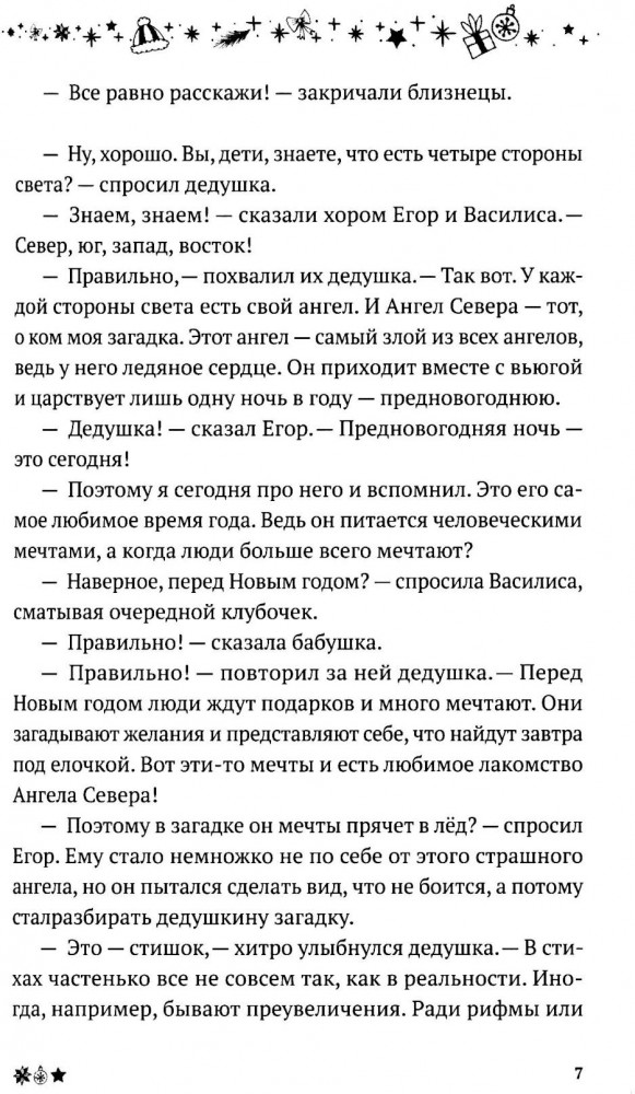 💳 Оплатить за товар можно при получении 🇰🇿 Есть бесплатная доставка по Казахстану 🎁 Копите бонусы с каждой покупки Хорошую новогоднюю сказку можно читать на зимних каникулах, её можно брать с собой в поездку. Хорошая новогодняя сказка умеет создать незабываемое настроение в любое время года! Друзья, вы держите в руках книгу, которая принесет в вашу жизнь волшебство. Она познакомит вас с четырьмя ангелами, а их можно встретить и в обычной жизни. Правда, здорово?.. Впрочем, не все ангелы добрые. Некоторые несут с собой обман, холод и предательство! Близнецы Егор и Василиса ничего об этом не знали, пока один ангел не разлучил близнецов. И пришлось Егору искать других ангелов, чтобы освободить сестру. На его пути встречались самые разные существа — веселые мастера-краснолюды из уральских пещер, жестокий Великий Полоз, пугающие и прекрасные птицы-алконосты... И даже сам бородатый Овсень! Но кто они? Что случилось потом? Удалось ли близнецам отыскать друг друга?.. Об этом вы узнаете, прочитав сказку! Приятного зимнего волшебства! |