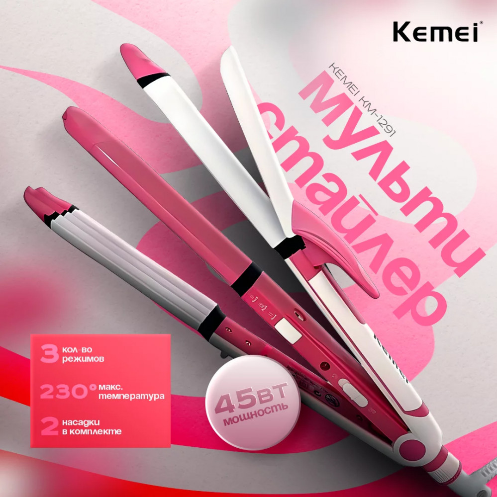 Kemei Мультистайлер KM-1291В данный момент этот товар отсутствует в продаже. Возможно, у нас найдется аналогичный или похожий товар здесь. Мультистайлер с мощностью 45 Вт — это универсальное устройство для создания различных укладок. В комплект входят насадки для выпрямления и спиральной укладки, которые обеспечивают разнообразие стилей для волос. Насадки имеют турмалиновое покрытие, что помогает предотвращать повреждения волос и придаёт им гладкость. Устройство оснащено функцией защиты от перегрева, что гарантирует безопасность в процессе эксплуатации. Конструкция включает петлю для подвешивания и вращающийся шнур, что делает использование стайлера удобным и комфортным. Мультистайлер имеет 3 режима работы и может нагреваться до 230°C, что позволяет быстро и эффективно выпрямить волосы. Индикация включения помогает контролировать процесс работы устройства. Страна производства — Китай, а стильный розовый цвет придаёт устройству привлекательный внешний вид. |