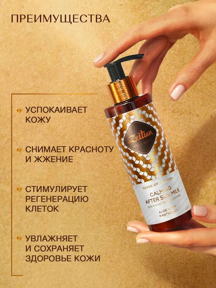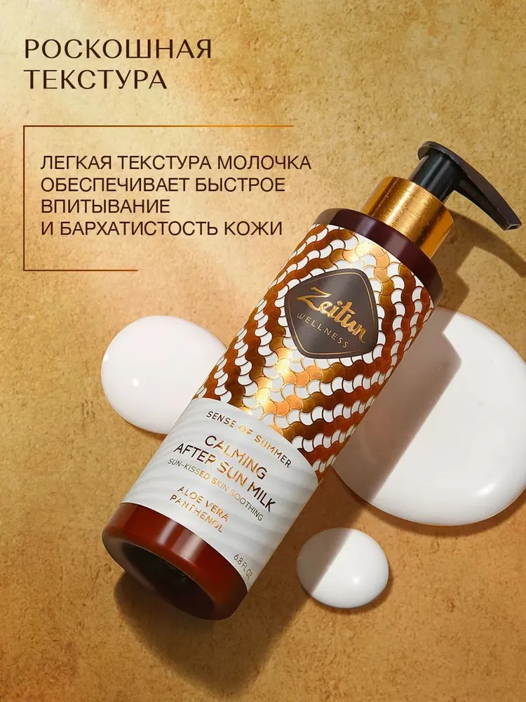 Zeitun Молочко после загара «Sence of Summer. Ритуал Солнца»В данный момент этот товар отсутствует в продаже. Возможно, у нас найдется аналогичный или похожий товар здесь. Серия: Wellness Окружите кожу заботой и комфортом с молочком после загара Zeitun WELLNESS «Ритуал Солнца». Несмываемое увлажняющее молочко обеспечивает успокаивающий уход после солнца и солярия, устраняет шелушение, стимулирует регенерацию. Уходовая формула средства обогащена пантенолом, глицерином и натуральными экстрактами. Алоэ вера освежает и удерживает влагу в клетках кожи, витамин Е обладает защитой от окислительного стресса, пантенол снимает красноту и жжение. Молочко для лица увлажняющее можно использовать не только на море, но и ежедневно, а также после пилинга, скраба или солярия. Молочко после загара не оставляет белых следов и не пачкает одежду. Нежная невесомая текстура не оставляет жирной плёнки, ощущения липкости, равномерно распределяется по коже, благодаря чему загар ложится максимально ровно. Крем после загара универсален, подходит для лица и для тела, наполнен нежнейшим, невесомым ароматом свежести, моря, солнца и соли. |