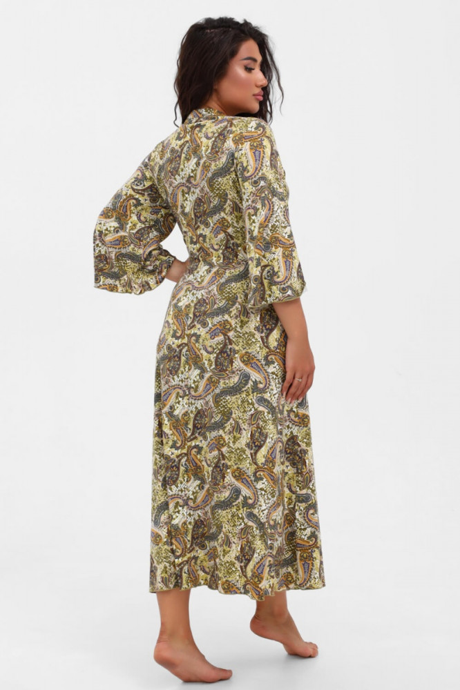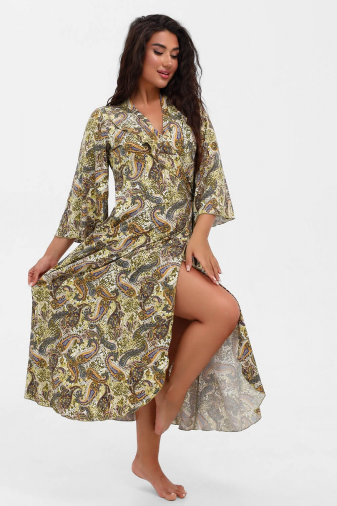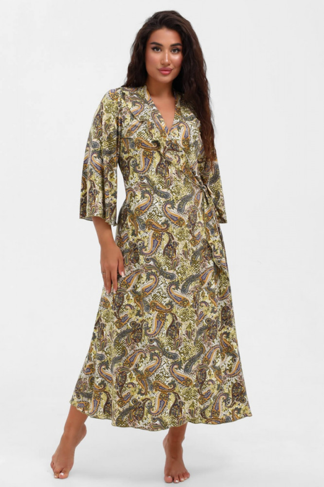 Запашной халатик из тонкой нежной вискозы. Приталенный силуэт, длина до середины голени, рукав широкий ¾. Отделка горловина — волан.