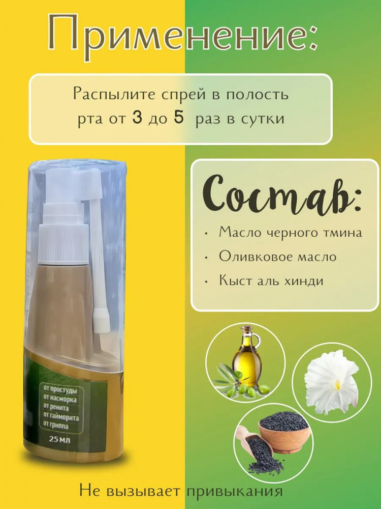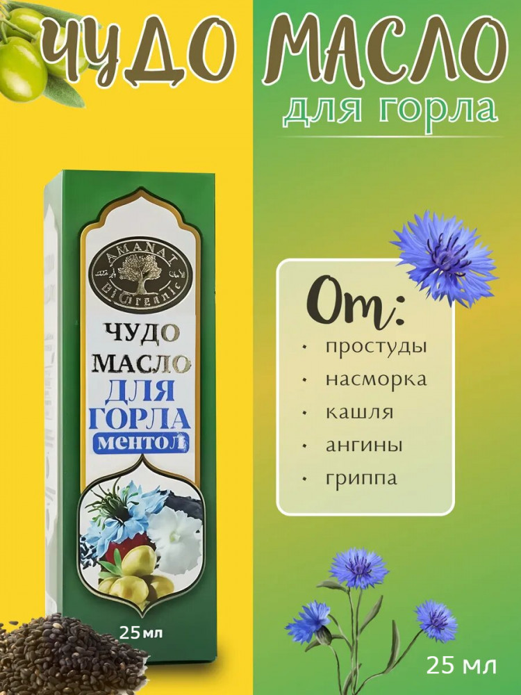 Средство для лечения горла облегчает и снижает боль, убирает першения в горле, тем самым протекание болезни становится лёгким. Далеко не секрет какими лечебными свойствами обладают эти растения и масла на основе них, ведь именно они применяются в народной медицине во время простудных заболеваний. Масло черного тмина и кыст аль хинди местный антисептик. Эффективно обеззараживает полость горла, при этом не пересушивая ее благодаря масляному составу. Способствует быстрому заживлению.