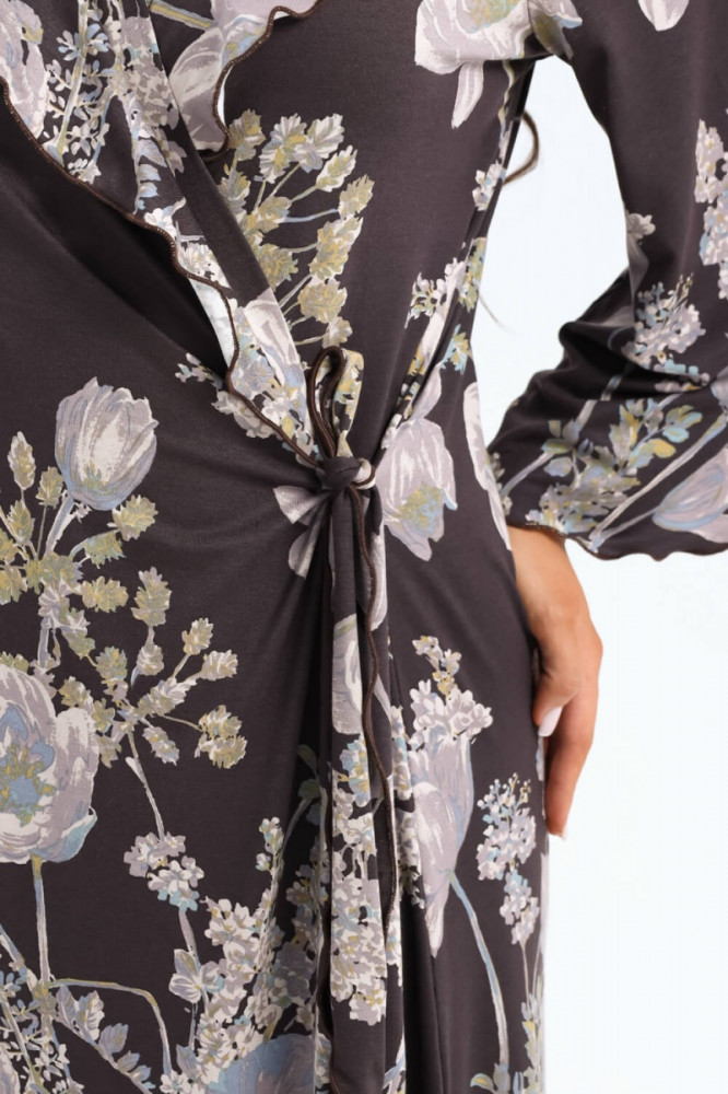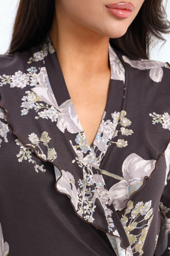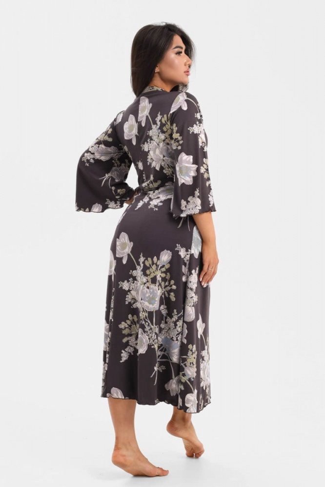 Запашной халатик из тонкой нежной вискозы. Приталенный силуэт, длина до середины голени, рукав широкий ¾. Отделка горловина — волан.