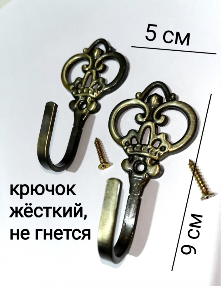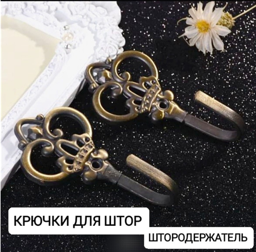 Элегантные крючки для штор с винтажным дизайном в форме короны станут стильным акцентом вашего интерьера. Изготовлены из прочного металла с антикварным покрытием под бронзу, они не только выполняют функцию держателей для штор, но и украшают помещение. Идеально подойдут для классических и винтажных интерьеров, а также для оформления в стиле барокко или ретро.