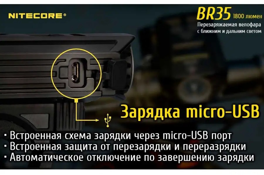Nitecore BR35 — это фонарь, созданный специально для велопоездок. Он обладает рядом качеств, не присущих обычным карманным фонарям, что делает его идеальным спутником для поездок на велосипеде в темное время суток. BR35 имеет встроенный Li-Ion аккумулятор емкостью целых 6800 mAh, который позволит фонарю работать непрерывно в течение 17 часов. Встроенный порт micro-USB служит для подзарядки от любых источников питания, в том числе и внешних: Powerbank, солнечная панель, автомобильный адаптер, зарядное устройство Nitecore F1 и т.д. Вам не придется волноваться о перспективе остаться без света в темноте. Встроенная плата обеспечит защиту от избыточного заряда и автоматически прекратит зарядку при 100% емкости аккумулятора.