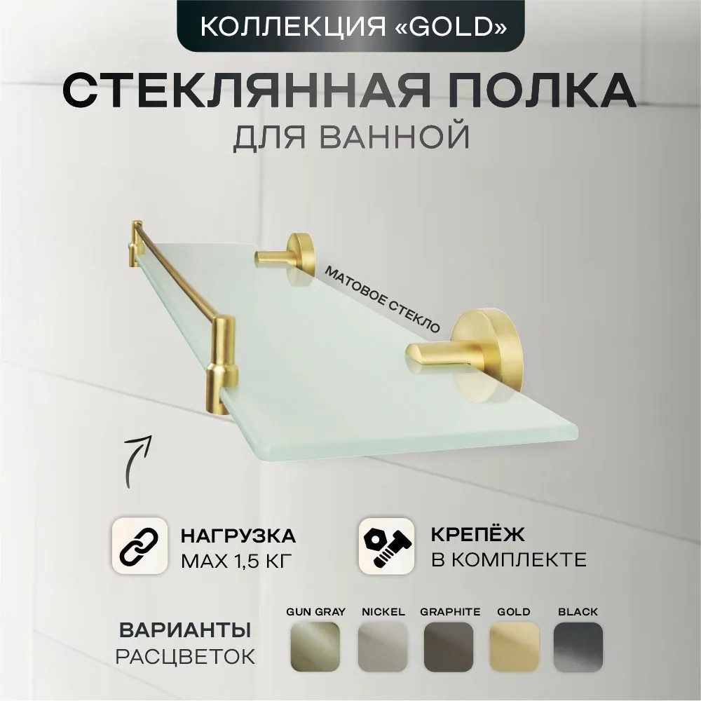 Комплектация: полка для ванной комнаты — 1 шт., держатели полки, комплект крепежей.