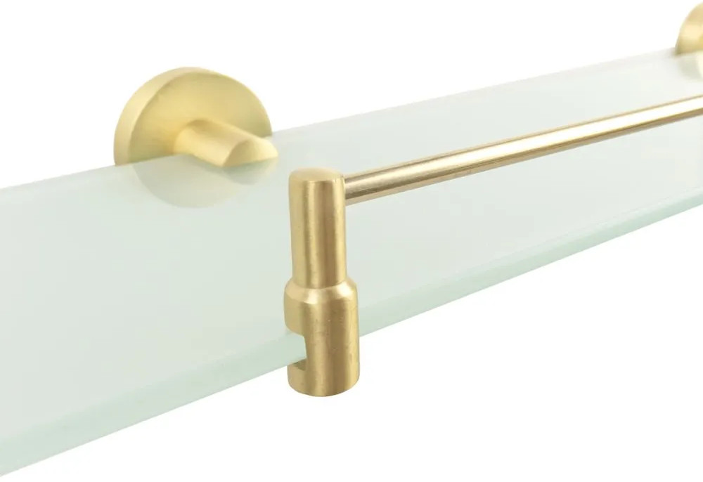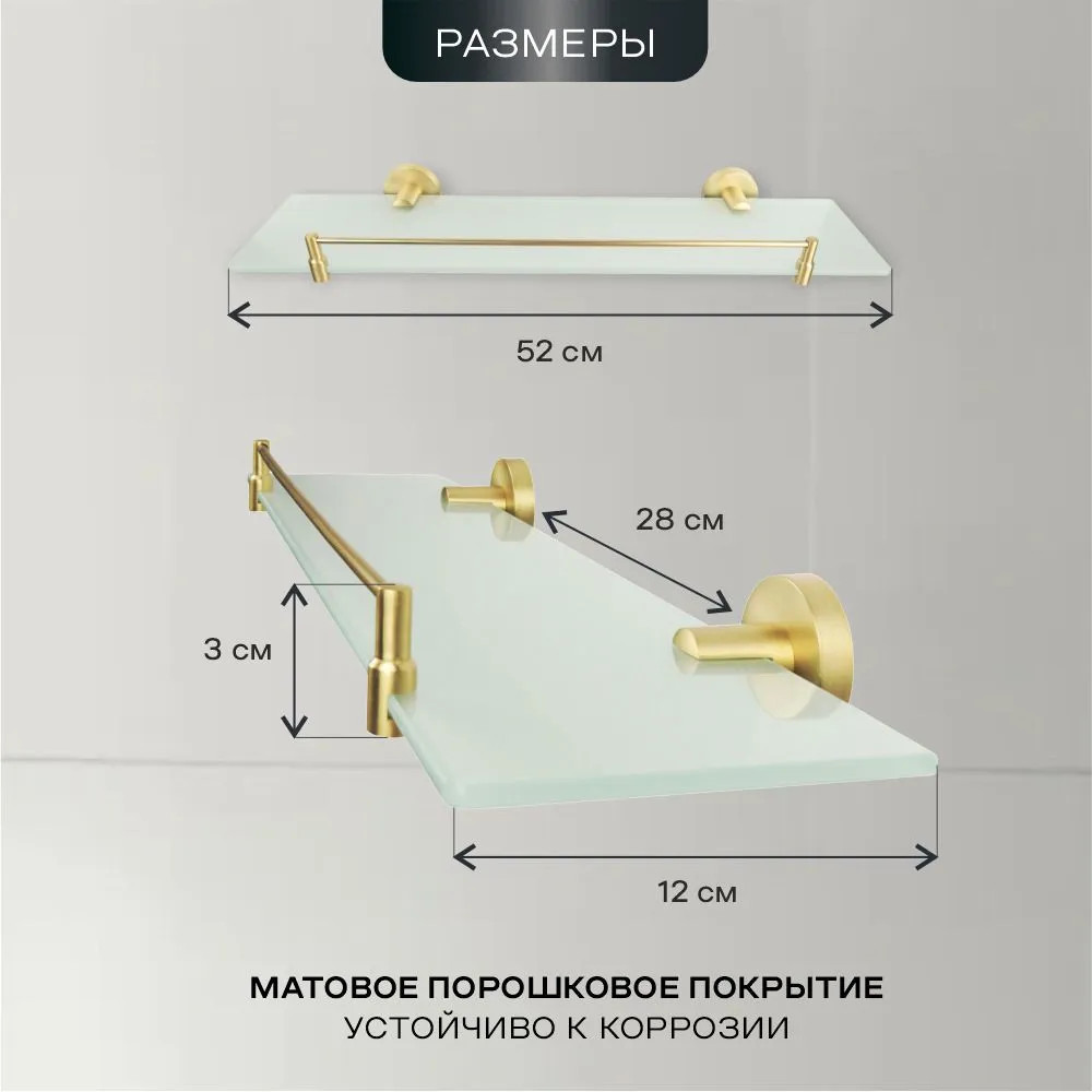 Полка прямоугольной формы, выполнена из металла и матового стекла. Аксессуар гармонично впишется в любой интерьер ванной комнаты. Поможет эргономично использовать пространство для хранения средств гигиены. Конструкция имеет борт в виде металлического кронштейна. Перегородка высотой 3 см обезопасит от падения предметов с полки. Благодаря размеру и форме изделия, на нем можно расположить флакон с шампунем или бальзамом, стакан с кистями для макияжа, бритвенный станок, крема, линзы, средства для умывания лица и т. д. Все необходимые вещи будут всегда на виду и под рукой. Полка прямая монтируется к стене при помощи крепежа, входящего в комплект. Высокая устойчивость к коррозии. Максимальная нагрузка — 1,5 кг.