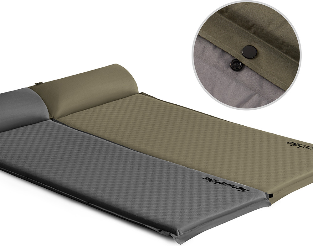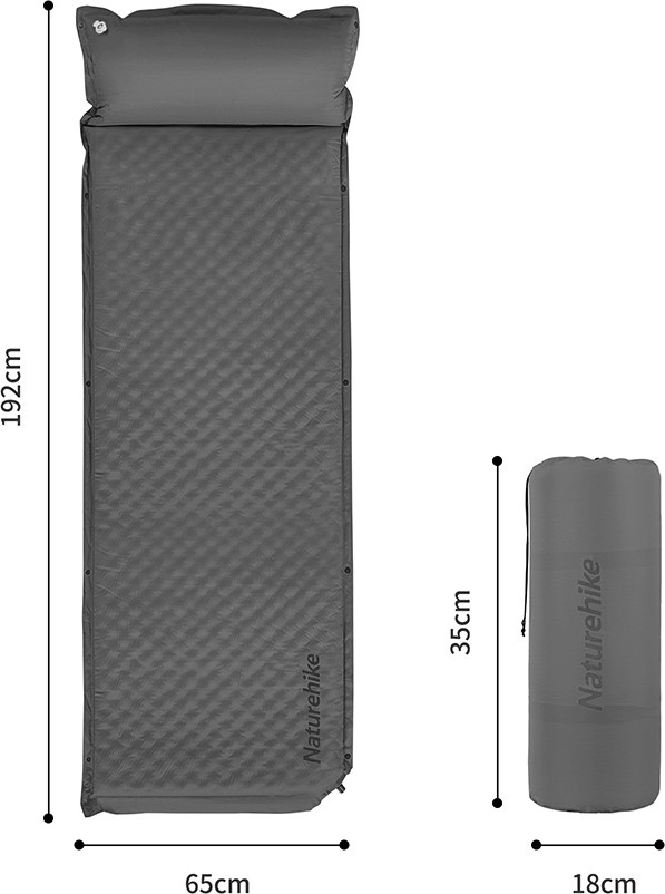 В сложенном виде размеры коврика Naturehike составляют 23×32 см, вес — 1.7 кг, что делает его компактным и удобным для транспортировки. В комплекте предусмотрен чехол. В конструкции самонадувного коврика также предусмотрена соединительная система. С помощью кнопок можно скрепить два коврика в один большой, чтобы создать полноценное спальное место для двух человек.
