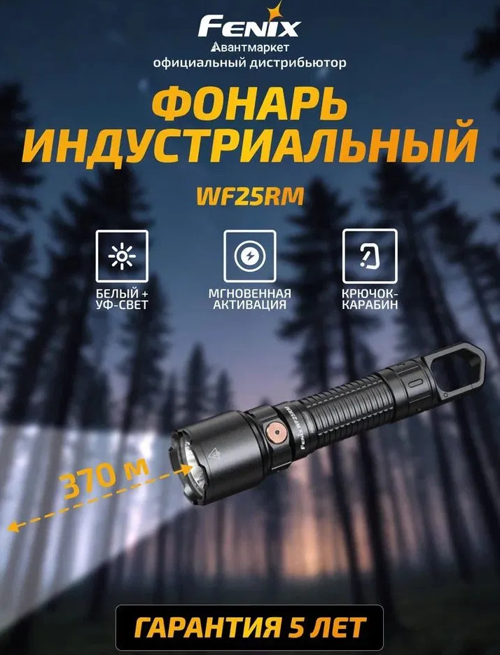 В фонаре WF25RM установлен мощный светодиод Luminus SST70 со сроком службы 50 000 часов. Благодаря яркости в 3000 люмен дальнобойность луча достигает 370 метров.