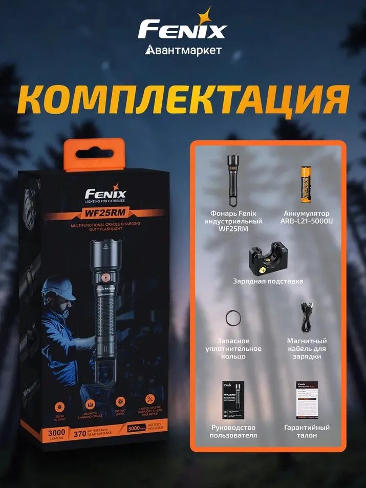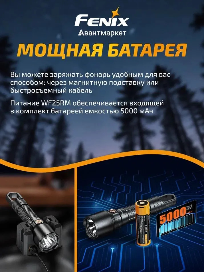 Универсальный фонарь Fenix WF25RM работает от перезаряжаемого аккумулятора ARB-L21-5000U емкостью 5000 мАч. Заряжается аккумулятор несколькими способами — быстросъемный магнитный кабель можно подключать к подставке для зарядки или напрямую к фонарю. Благодаря индикатору пользователь всегда будет в курсе уровня заряда батареи.