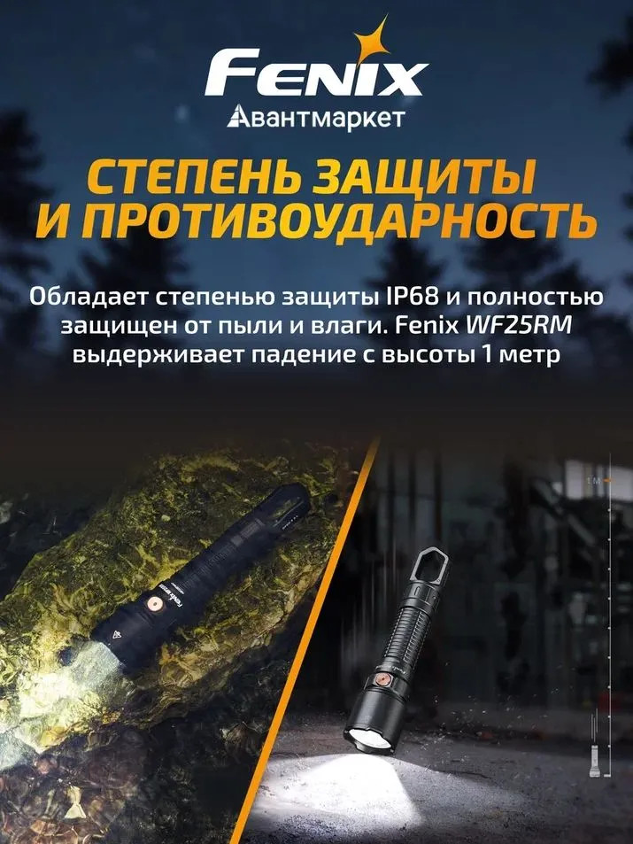 Корпус Fenix WF25RM изготовлен из прочного алюминиевого сплава A6061-T6 с анодированным антиабразивным покрытием премиум-класса типа HAIII. Прибор защищен от воды и пыли в соответствии со стандартом IP68, его можно полностью погружать в воду на глубину до 2 метров. Также он способен выдержать падение с высоты 1 метра. |