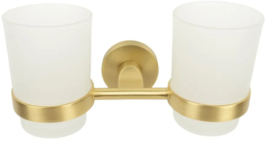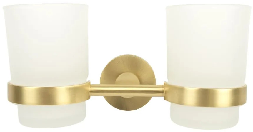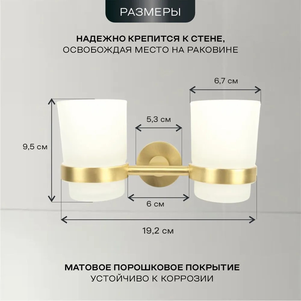 Изделие выполнено из металла и матового стекла. Стеклянные предметы отличаются своей прозрачностью и придают ощущение легкости и воздушности. В комплекте 2 съемных стакана цилиндрической формы, объемом по 150 мл. Держатель металлический с антикоррозийным покрытием. Двойная подставка для зубных щеток и пасты монтируется к стене при помощи крепления, входящего в комплект. Настенная установка экономит пространство на раковине и придает удобство в использовании. Аксессуар можно использовать не только как стакан для зубных щеток или стакан для полоскания полости рта, но для бритвенного станка, расчески, как органайзер для хранения кистей для макияжа и других предметов гигиены.