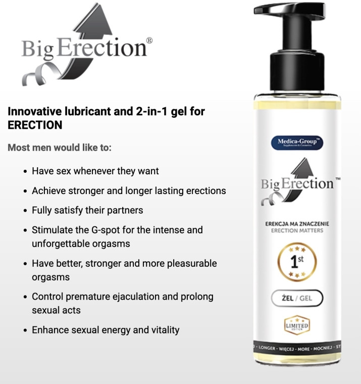 💳 Оплатить за товар можно при получении 🇰🇿 Есть бесплатная доставка по Казахстану от 1 дня 🎁 Копите бонусы с каждой покупки BigErection — гель для усиления эрекции и продления полового акта. Он создан для мужчин, желающих достичь более сильной и продолжительной эрекции, контролировать преждевременную эякуляцию и повысить сексуальную энергию. Благодаря уникальному составу гель усиливает чувствительность, стимулирует кровообращение и помогает полностью удовлетворить партнёршу. BigErection можно использовать с презервативами и аксессуарами, он безопасен, гипоаллергенен и обладает возбуждающим ароматом. Натуральные экстракты гуараны, женьшеня, хмеля и крапивы усиливают эрекцию и способствуют продлению акта. Глицерин и сорбитол увлажняют, смягчают кожу и повышают эластичность, а ванилилбутиловый эфир усиливает ощущения. Использовать гель просто: наносите 1–2 раза в день на половой член, распределяя по всей длине. Для максимального эффекта сочетайте с капсулами — гель действует снаружи, а капсулы усиливают результат изнутри. BigErection — возвращает уверенность и яркие ощущения в интимную жизнь. |