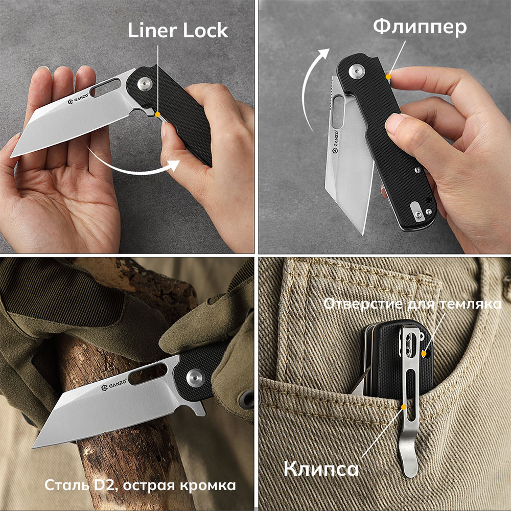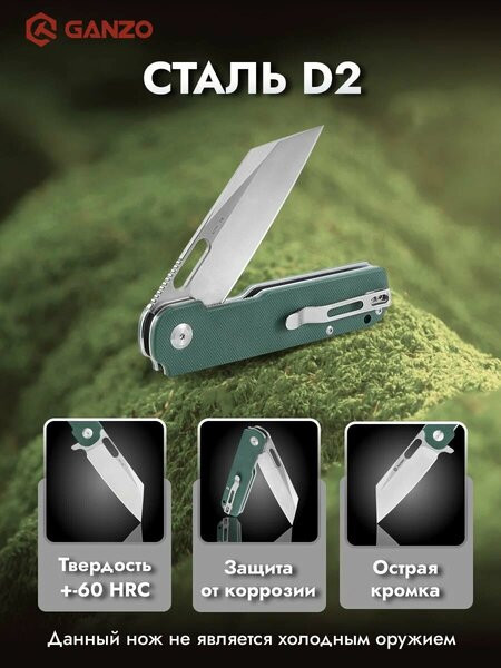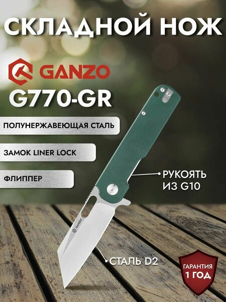 Ganzo G770-GR — это складной EDC-нож, который отлично подходит для туризма, охоты и повседневного ношения. Он обладает широким прочным лезвием reverse tanto из стали D2, которое сочетает длинную режущую кромку и острый кончик. Такая форма ножа Ganzo делает его универсальным как для режущих, так и для колющих работ. Нож Ganzo G770-GR — универсальный и практичный инструмент для различных ситуаций.