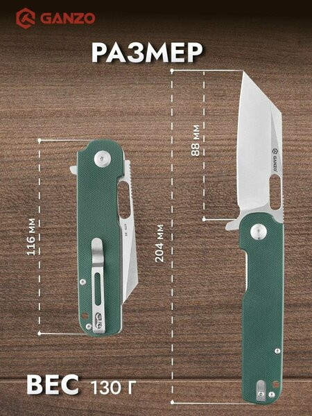 Флиппер и подпальцевое отверстие отвечают за быстрое и удобное раскрытие ножа. Два способа открытия делают нож максимально универсальным, — его можно раскрыть в любых условиях, как одной, так и двумя руками. Также у туристического ножа имеется клипса для крепления на кармане и отверстие для темляка, которые упрощают переноску и хранение ножа. Общая длина ножа Ganzo G770-GR составляет 204 мм, длина клинка — 88 мм. Вес ножа — 130 г, что делает его легким и удобным для ношения. Клинок формы reverse tanto обеспечивает точный и эффективный рез.