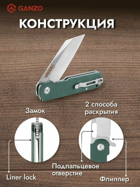 Кемпинговый нож Ganzo оснащен замком Liner Lock. Это простой и удобный механизм, который позволяет использовать нож одной рукой. Внутри конструкции скрыта подпружиненная пластина, которая надежно фиксирует лезвие в открытом положении, не позволяя ему закрыться во время работы. Для закрытия ножа необходимо надавить на пластину большим пальцем, позволяя ему сложиться.