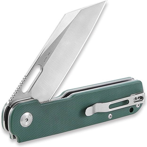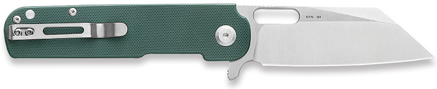 Клинок выполнен из стали D2. Это инструментальная сталь с высоким содержанием углерода и хрома, благодаря чему она обладает высокой вязкостью и защищена от ржавления. Из всех высокоуглеродистых сталей D2 — самая стойкая к коррозии сталь. Благодаря твердости ±60 HRC режущая кромка надолго сохраняет остроту. Рукоять G770-GR изготовлена из стеклотекстолита G10, который отличается прочностью и устойчивостью к износу и механическим повреждениям. Материал не боится влаги, перепадов температур и не впитывает запахи. Зеленый цвет накладок придает ножу современный и стильный вид.