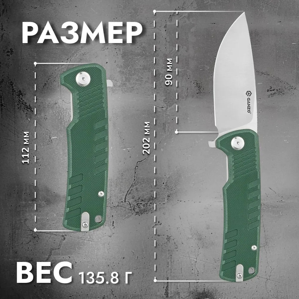 Общая длина ножа Ganzo G769-GR составляет 20,2 см, из которых длина лезвия — 9 см, а рукояти — 11,2 см. Толщина клинка 3,5 мм обеспечивает прочность и устойчивость к нагрузкам при разрезании плотных материалов или зачистке веток. Нож весит 135,8 г, что делает его легким и удобным для постоянного ношения.