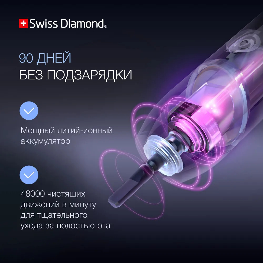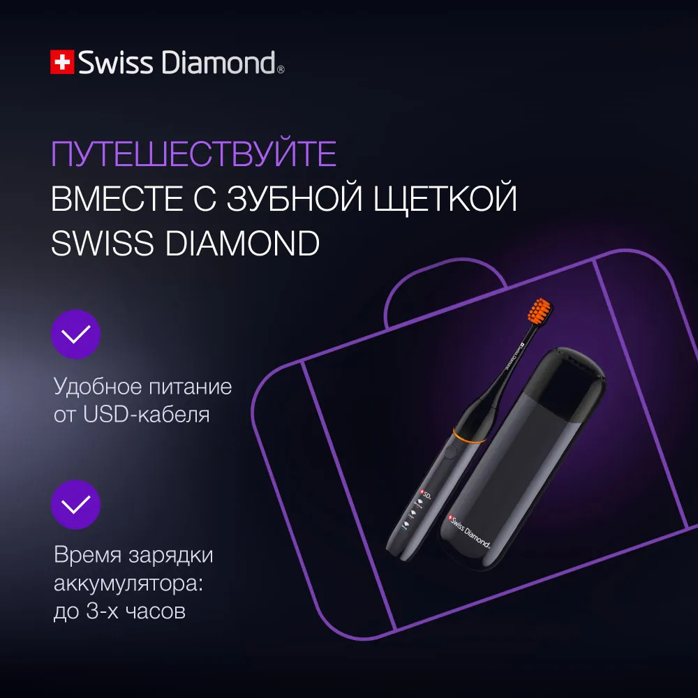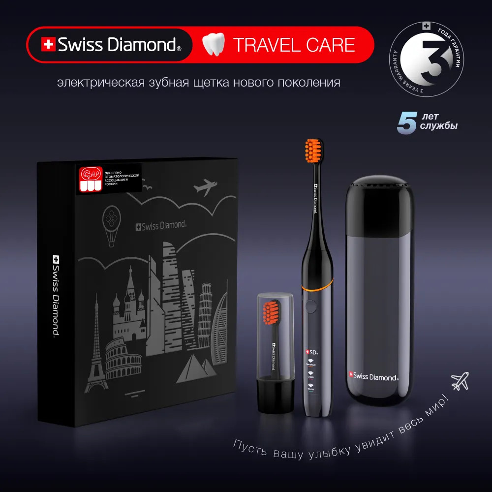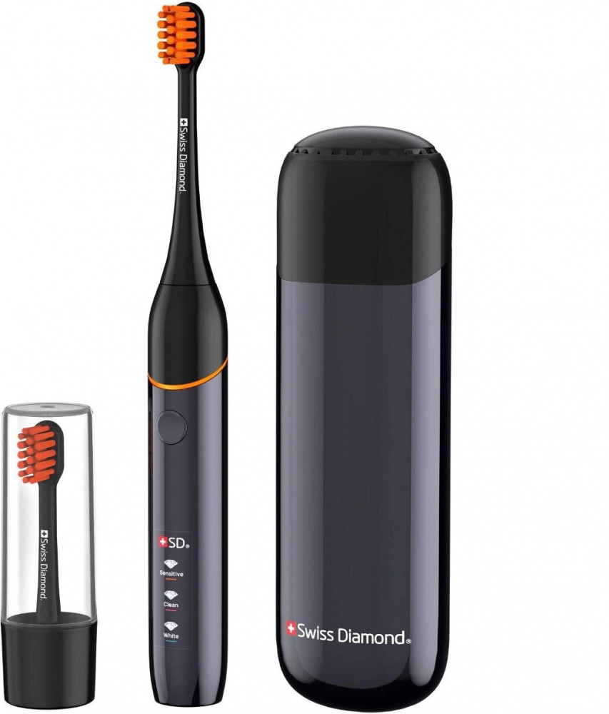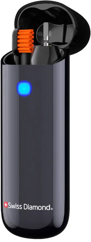Ультразвуковая электрическая щетка Swiss Diamond Travel Care обеспечит 360 минут непрерывной работы — три месяца ежедневного использования утром и вечером.