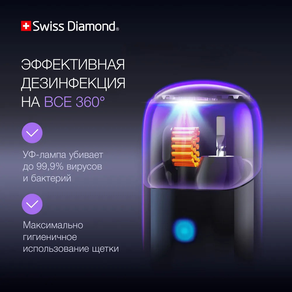 • дезинфекция на 360 В комплекте идет дорожный чехол, который оснащен УФ лампой, такое решение позволяет дезинфицировать насадку ультрафиолетом, что делает использование щетки максимально гигиеничным. Длина волны лампы — 275 нм, что позволяет устранить 99% бактерий и вирусов, скопившихся на головке щетки, за 5 минут обработки;