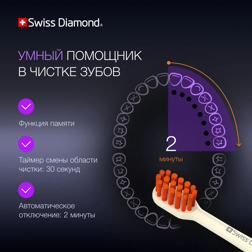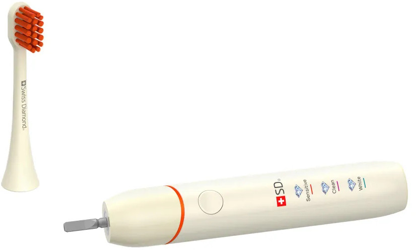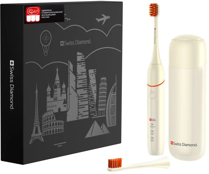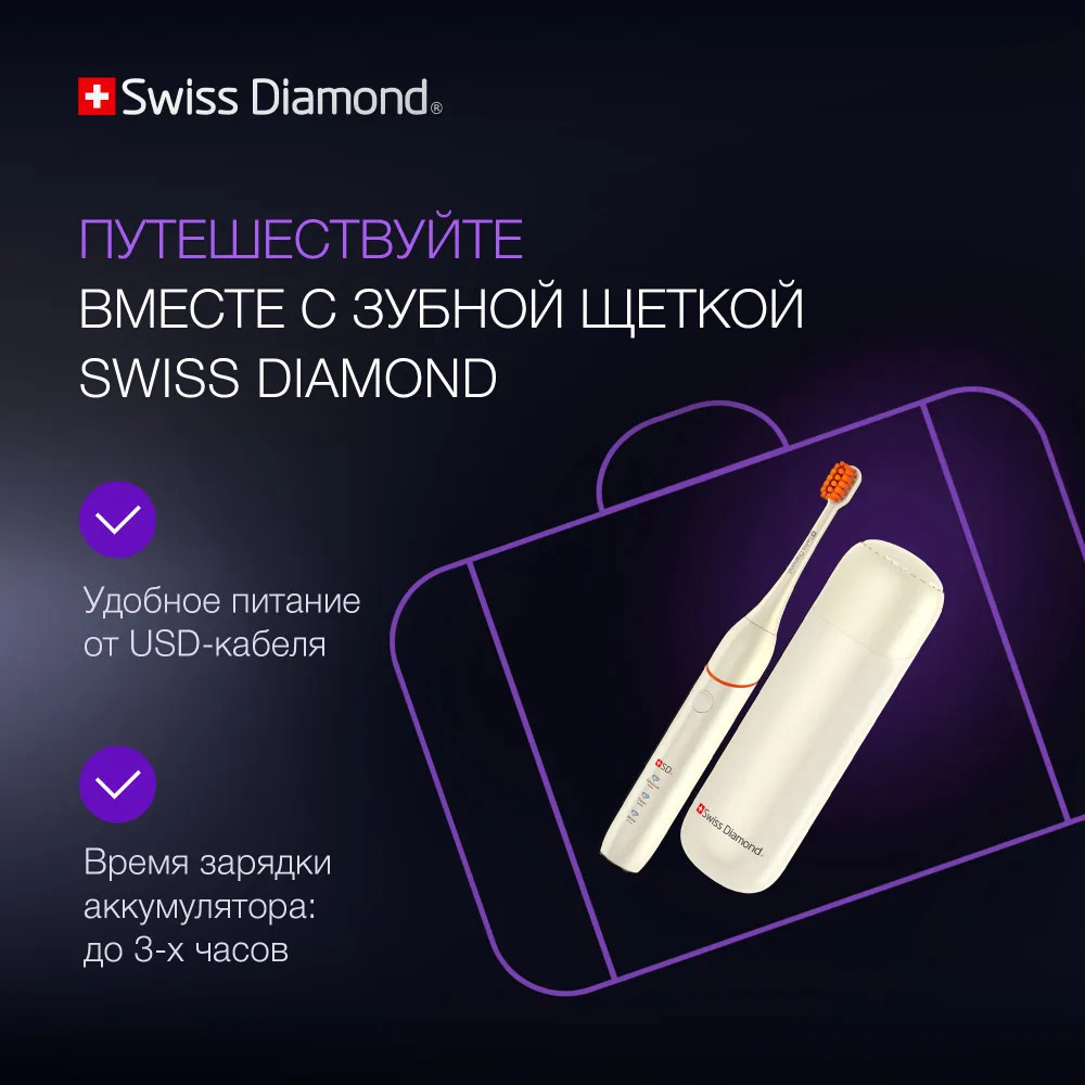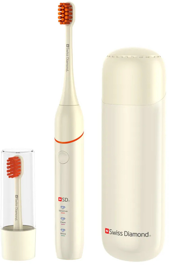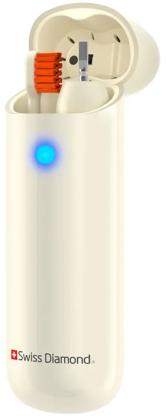 Ультразвуковая электрическая щетка Swiss Diamond Travel Care обеспечит 360 минут непрерывной работы — три месяца ежедневного использования утром и вечером.