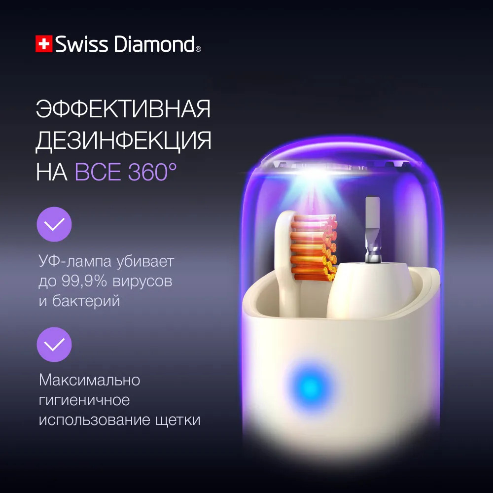• дезинфекция на 360 В комплекте идет дорожный чехол, который оснащен УФ лампой, такое решение позволяет дезинфицировать насадку ультрафиолетом, что делает использование щетки максимально гигиеничным. Длина волны лампы — 275 нм, что позволяет устранить 99% бактерий и вирусов, скопившихся на головке щетки, за 5 минут обработки;