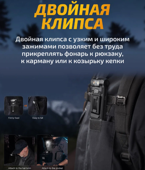 Для комфорта эксплуатации повседневный фонарь SW05R-UV обладает двумя типами крепления. Благодаря магнитному креплению и универсальной клипсе, фонарь можно удобно фиксировать на одежде, снаряжении или металлических поверхностях. Конструкция клипсы обладает двумя зажимами — узким и широким. Благодаря этому фонарь можно надежно закрепить на самой разной экипировке. Магнитный хвост позволяет использовать Fenix SW05R-UV без помощи рук.