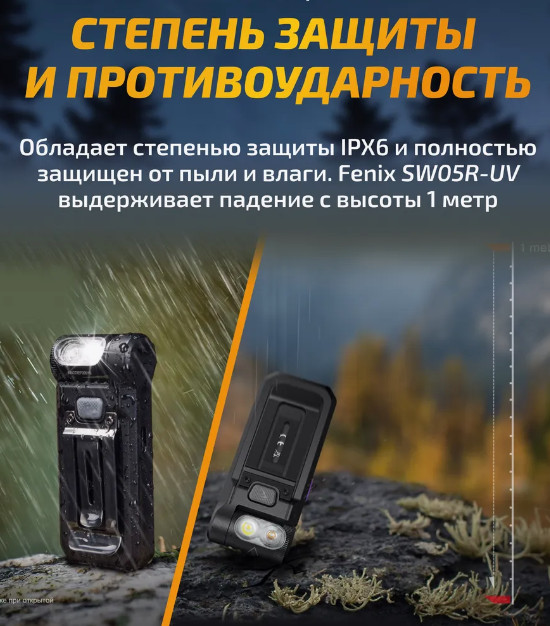 Фонарь Fenix SW05R-UV соответствует стандарту защиты IPX6, что делает его устойчивым к сильному дождю и брызгам воды. Он также обладает прочной конструкцией, прошел испытания на падение с высоты 1 метра и способен выдерживать повседневное использование в экстремальных условиях.