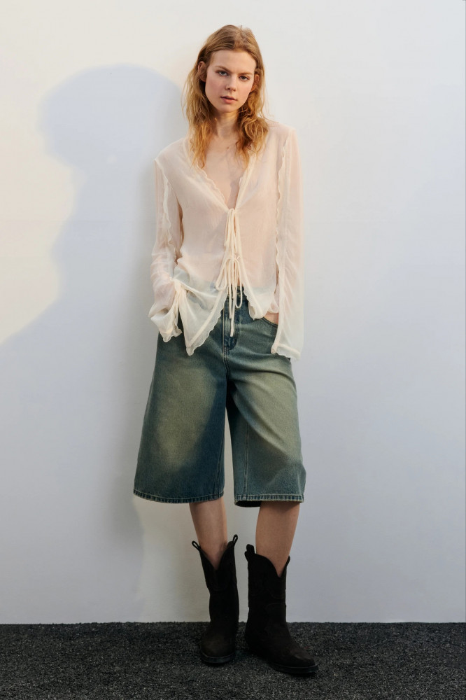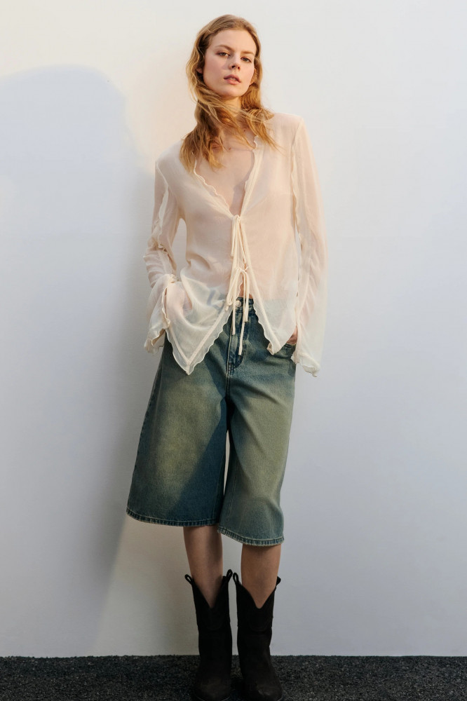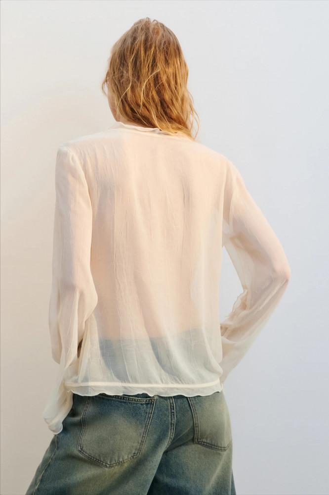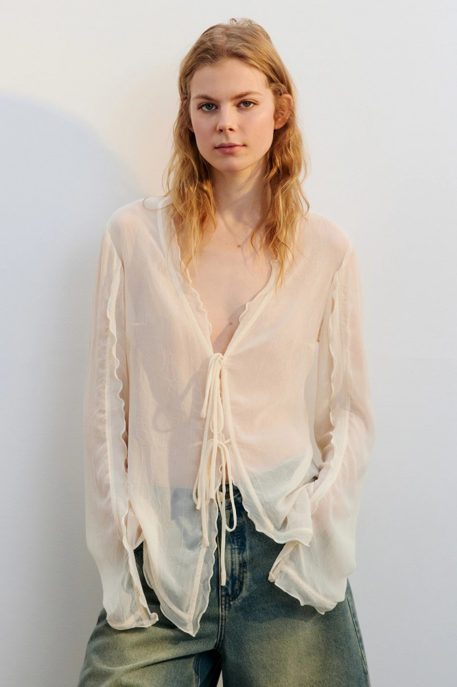 Женская блузка полуприлегающего кроя выполнена из тонкой, полупрозрачной жатой шифоновой ткани без подкладки. Глубокий V-образный вырез украшен волнистой отделкой, спереди — застёжка на завязки. Длинные рукава со слегка спущенной линией плеча дополнены волнистыми манжетами с разрезами. Нижний край изделия — волнистый. Эта лёгкая и воздушная шифоновая блузка подчеркнёт женственность и станет ярким акцентом стильных образов на каждый день и по особым случаям. Идеально сочетается как с дерзким денимом и кожей, так и с атласными юбками или романтичными брюками. Носи отдельно или в составе многослойных аутфитов — она добавит лёгкости, чувственности и весеннего настроения.
