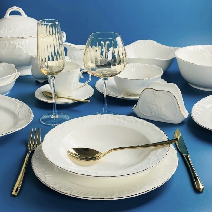 Обеденный сервиз из фарфора — воплощение роскоши и утончённости, создающее идеальную обстановку для праздничных ужинов и повседневных трапез. Строгий минимализм формы дополняют золотые вставки и декоративные линии, превращающие каждый предмет сервиза в произведение искусства. Полноценный комплект включает тарелки различных размеров, глубокие суповые миски, салатники, соусники, кофейные пары и десертные блюда, позволяющие подавать любые блюда с безупречным вкусом и комфортом.