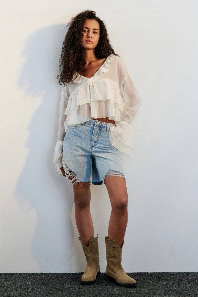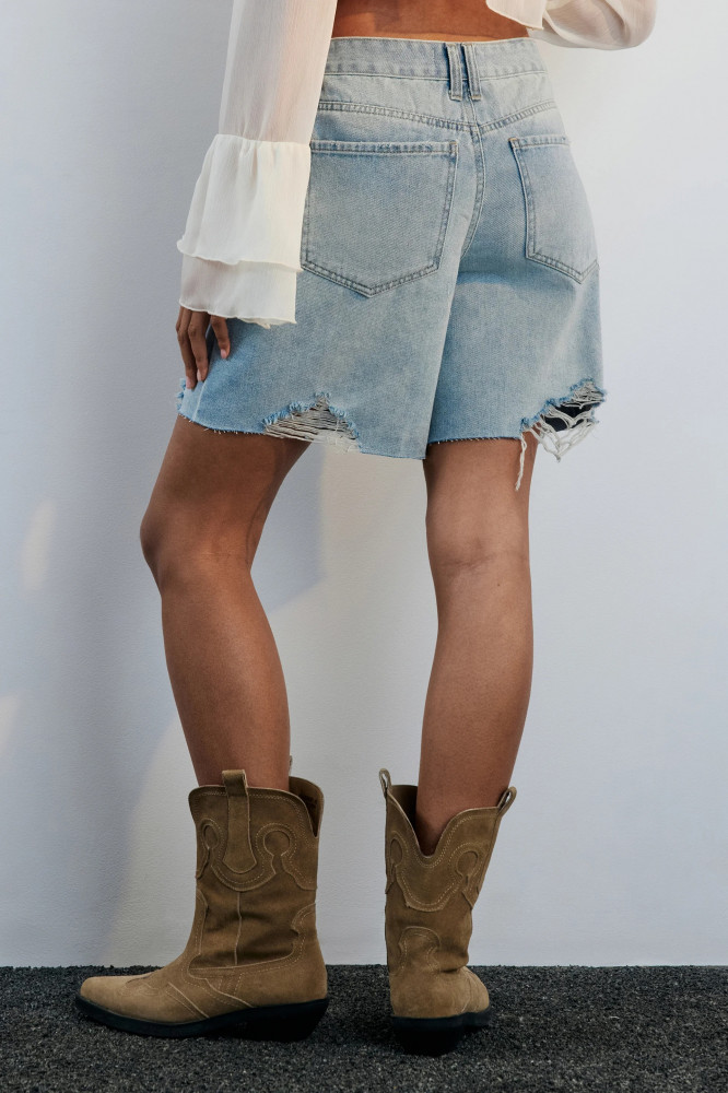 - Короткие женские джинсовые шорты прямого кроя из мягкого хлопкового денима с добавлением вискозы - Классическая средняя посадка подчеркивает фигуру и акцентирует внимание на талии. Короткие штанины с открытыми срезами, будто ты сама закастомизировала старые джинсы. Застежка на молнию и пуговицу спереди, шлевки для ремня. Классические джинсовые пять карманов с металлическими заклепками спереди - Светлые шорты с трендовым вареным эффектом. Стильные обрезанные джортсы из новой летней коллекции идеальны для расслабленных повседневных аутфитов на лето или для долгожданного отпуска в теплых краях. Удобные джинсовые шорты идеально сочетаются с любым верхом и составят отличную основу летнего гардероба. Эти шорты станут отличной основой актуальных образов в стиле y2k и бохо