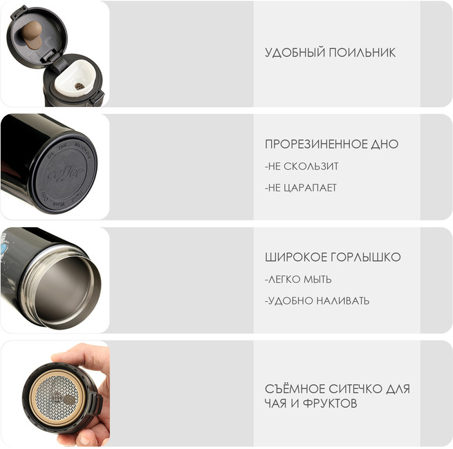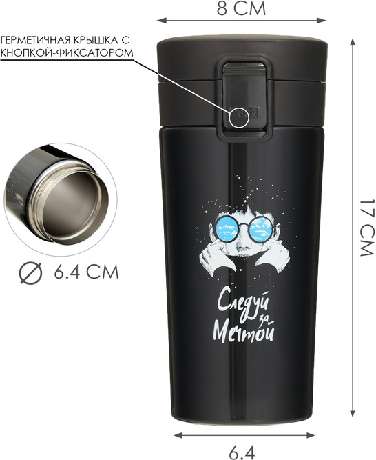 Термокружка — это отличное решение на каждый день для любителей чая и кофе. Термокружка подходит для использования в разных обстоятельствах: в офисе, идеальна для походов, длительных прогулок с ребенком или мини путешествий на природу. Многие используют её как инвентарь для отдыха, походов и туризма. Термокружку можно взять с собой на пикник, а также её можно взять с собой в поездки на дачу или на работу, чтобы напитки не остывали по дороге. Термокружка станет полезным и универсальным подарком.