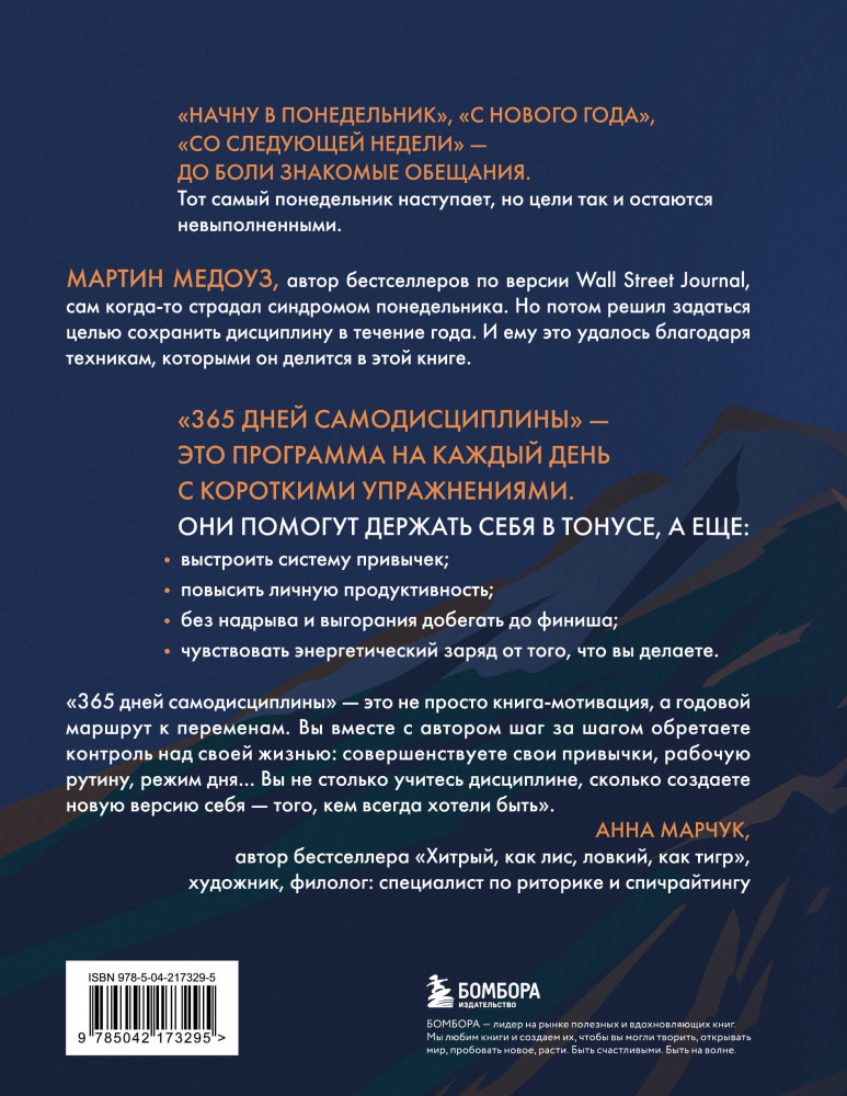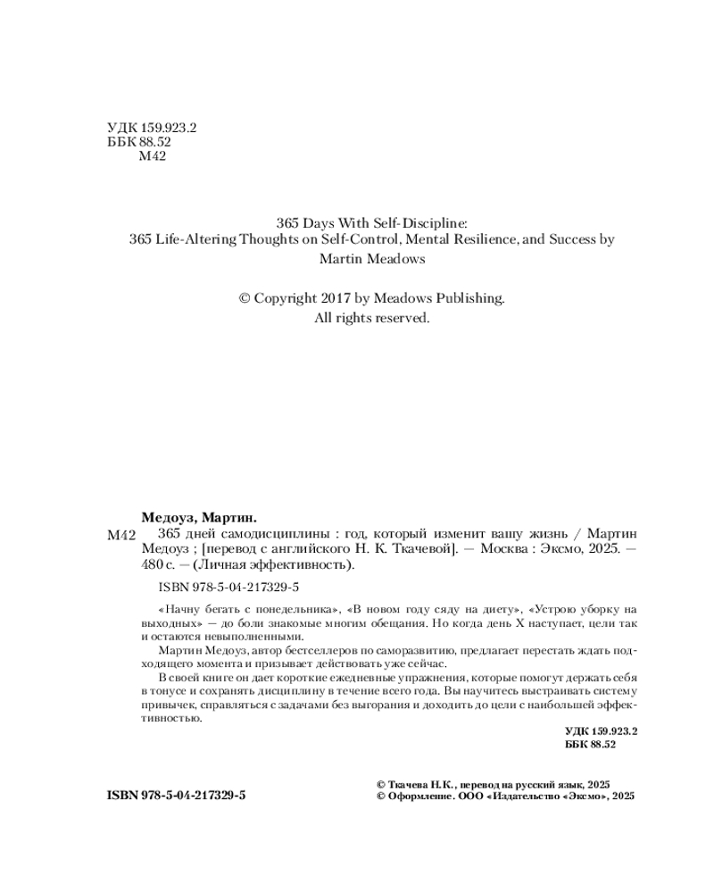 💳 Оплатить за товар можно при получении 🇰🇿 Есть бесплатная доставка по Казахстану от 1 дня 🎁 Копите бонусы с каждой покупки Серия: Личная эффективность. Книги, которые помогают сохранять тонус и фокус «Начну в понедельник», «с нового года», «со следующей недели» — до боли знакомые обещания. Тот самый понедельник наступает, но цели так и остаются невыполненными. Мартин Медоуз, автор бестселлеров по версии Wall Street Journal, сам когда-то страдал синдромом понедельника. Но потом решил задаться целью сохранить дисциплину в течение года. И ему это удалось благодаря техникам, которыми он делится в этой книге. «365 дней самодисциплины» — это программа на каждый день с короткими упражнениями. |