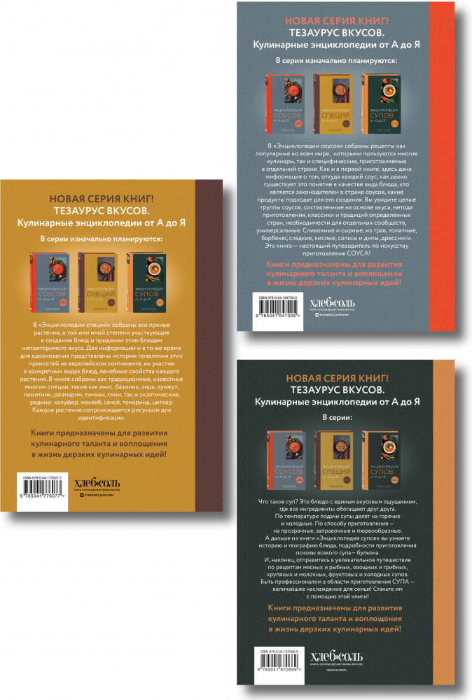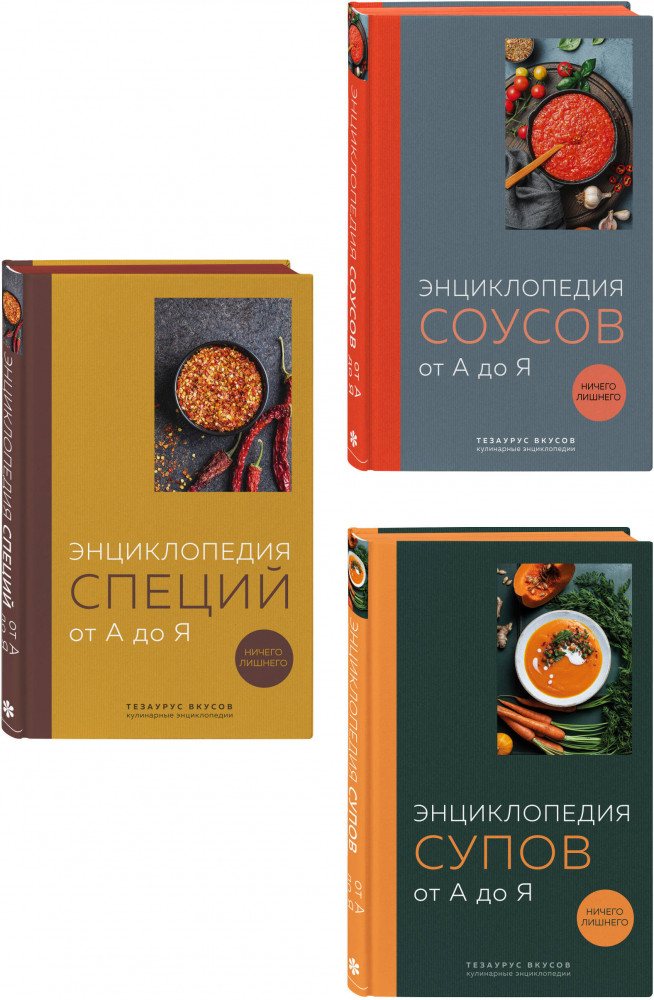 3 основных составляющих кулинарного искусства. От А до Я. Комплект из 3 книгВ данный момент этот товар отсутствует в продаже. Возможно, у нас найдется аналогичный или похожий товар здесь. Серия: Тезаурус вкусов. Кулинарные энциклопедии В этой серии собраны основополагающие кулинарные темы: «Специи», «Соусы», «Супы». |