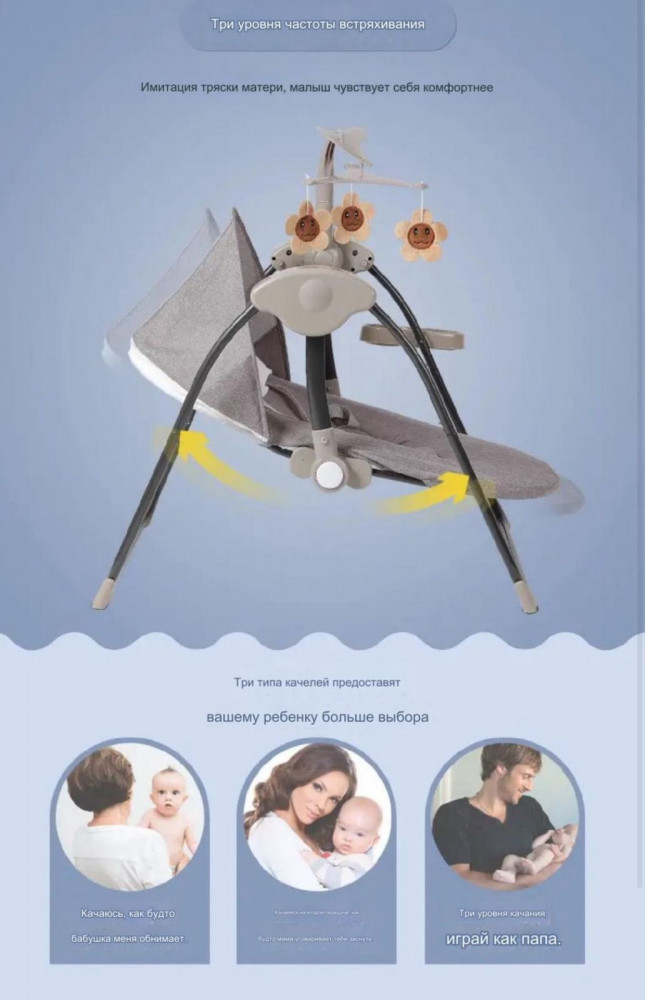 • регулируемые режимы: мы понимаем, что каждый ребенок уникален. Наша люлька предлагает несколько режимов покачивания и скорости, чтобы вы могли настроить её под индивидуальные потребности вашего малыша;