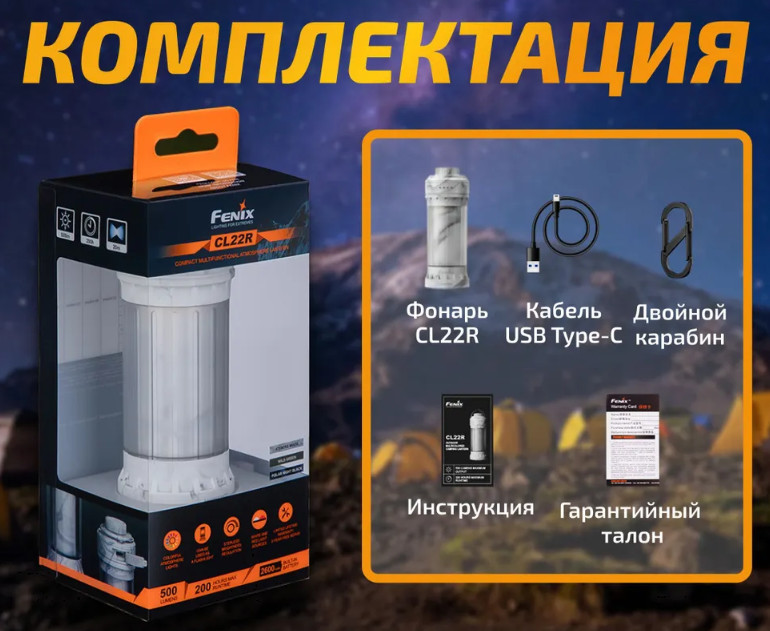 Fenix CL22R — это компактный и в то же время многофункциональный кемпинговый фонарь. Главная особенность модели — совмещение нескольких форматов освещения: в качестве ручного фонаря, освещение пространства на 360°, красный свет и разноцветная подсветка. Нижний режим освещения идеально подходит для локального подсвечивания больших зон, например, палаток и столов. Красный свет и разноцветная подсветка делает фонарь полезным не только для освещения, но и для создания уютной или романтической атмосферы, что особенно ценят туристы и любители кемпинга.