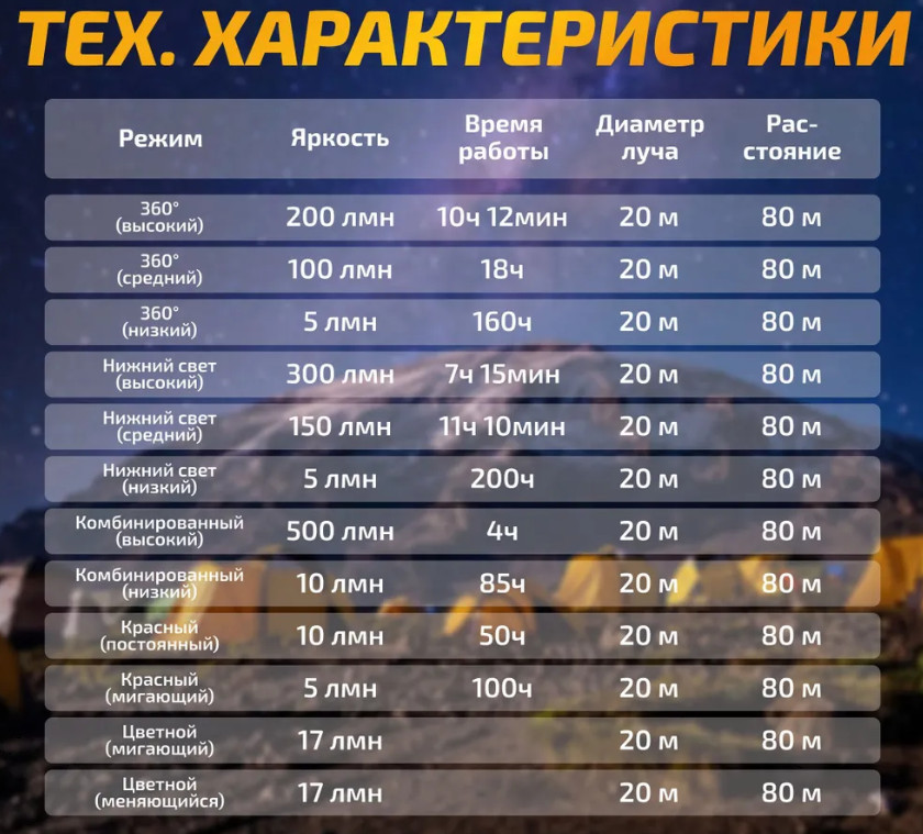 Максимальная яркость фонаря — 500 люмен. Этого света достаточно для освещения пространства с диаметром до 20 метров в режиме 360°. При включении режимов нижнего света, осветительное устройство можно использовать в качестве ручного фонаря, который освещает до 80 метров. При этом оба режима можно использовать одновременно, обеспечивая максимальную яркость.