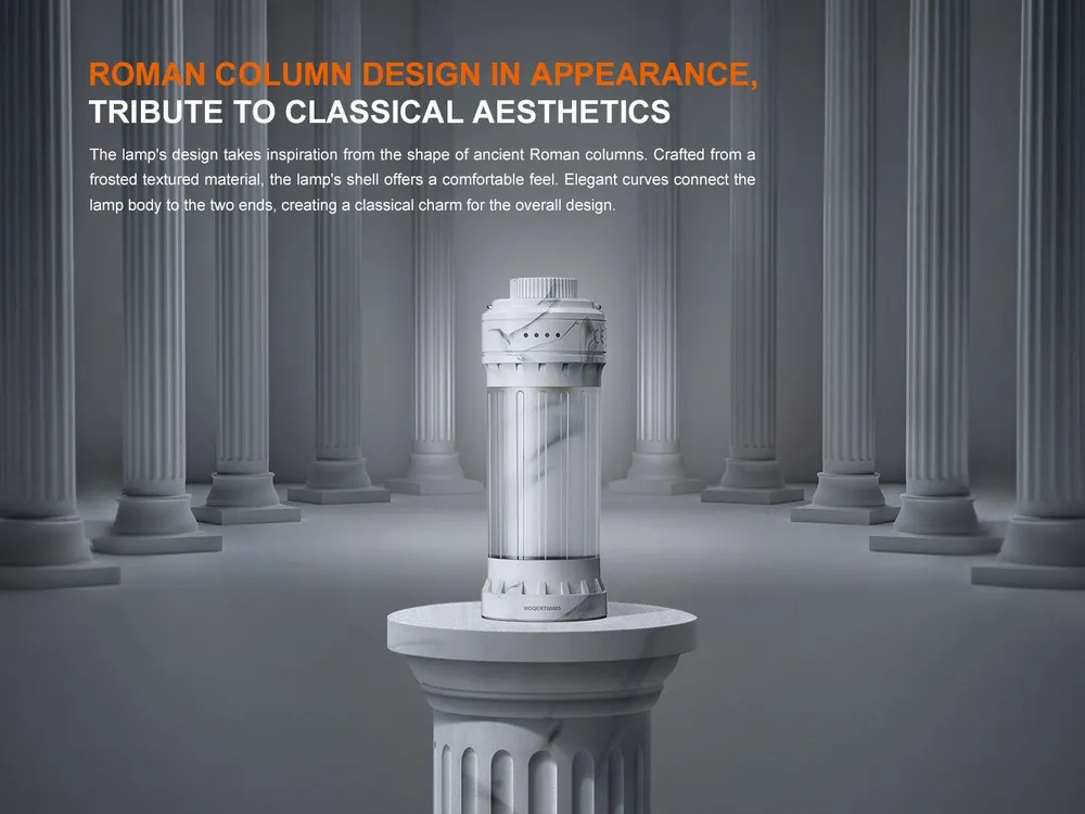 В комплекте с легким фонарем идет карабин. Благодаря креплению на верхней части, фонарь можно зацепить на рюкзаке, верхней части палатки или в любом другом удобном для себя месте. Дизайн белого фонаря оформлен в виде римской колонны с разводами, напоминающими мраморную поверхность. Фонарь совмещает не только эффективную работу, но и эстетически привлекательный вид, поэтому станет отличным подарком на любой праздник.