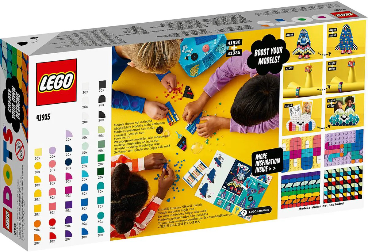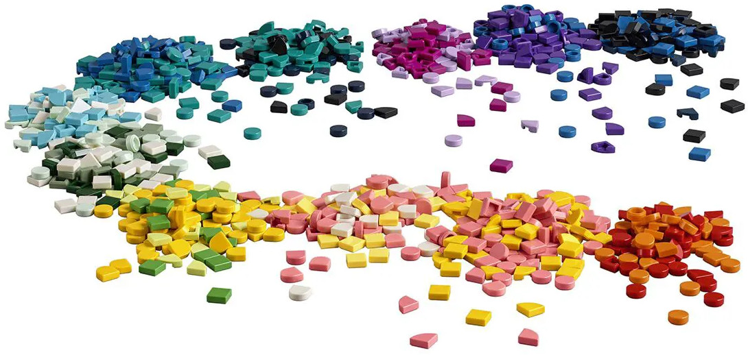 Расширяйте творческое воображение ребенка с помощью более чем 1000 тайлов — это богатое полотно ярких цветов, некоторые из которых никогда раньше не встречались в наборах DOTS. Что в коробке? Ничего, кроме чистых, великолепных, красочных элементов DOTS! Тайлы DOTS 44 различных типов и изрядная доля вдохновения помогут детям украшать браслеты, предметы интерьера или любые другие наборы LEGO®. Дети, которым нравится искусство и поделки, полюбят «Большой набор тайлов» (41935). Эти тайлы внесут разнообразие в любые групповые занятия поделками или станут замечательным праздничным подарком для мальчиков и девочек в возрасте от 6 лет. Наборы LEGO® DOTS (продаются отдельно) — это привлекательные поделки, которые дети создают и используют сами. Коробка разноцветных тайлов укрепит уверенность ребенка в своем творческом таланте и мастерстве и поможет классно провести время.