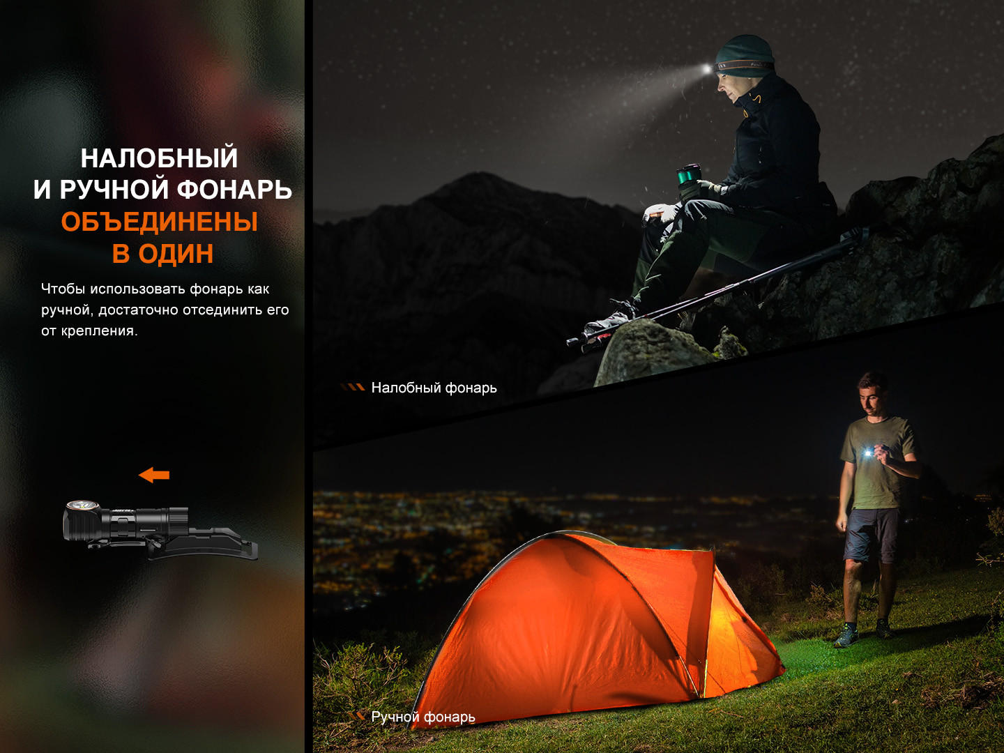 • 2-в-1 — налобный фонарь и портативный фонарь;