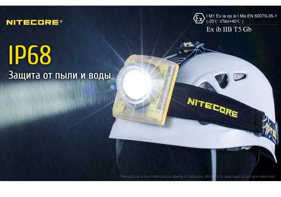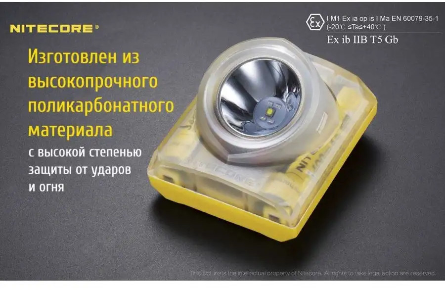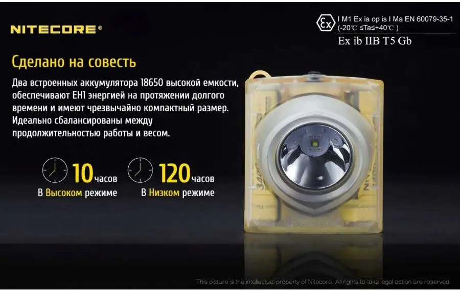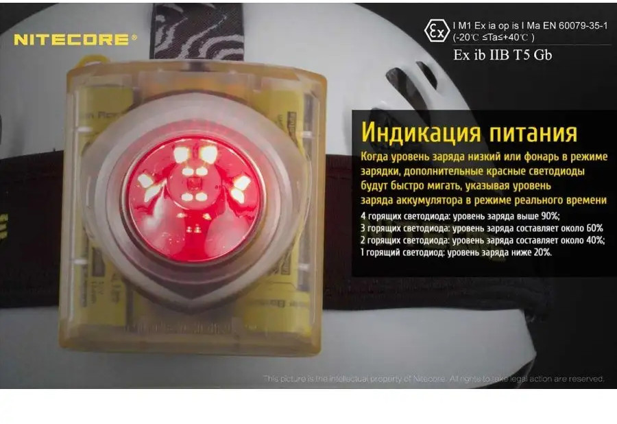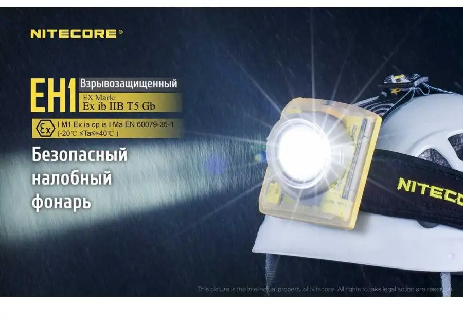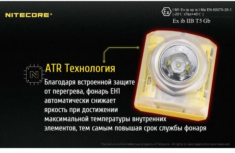 • Nitecore EH1 способен выдержать температуру окружающей среды до 100° C, что соответствует действующему температурному классу Т5;