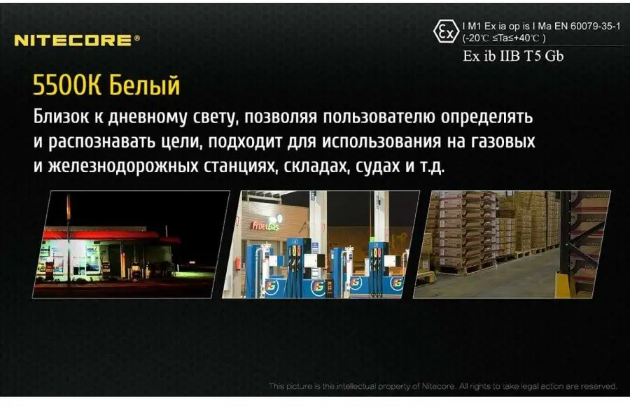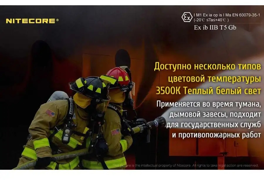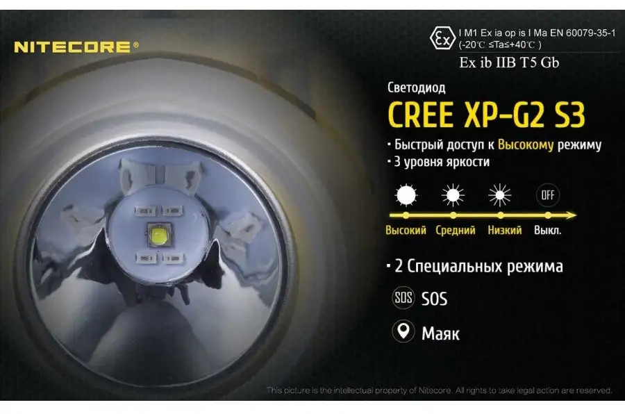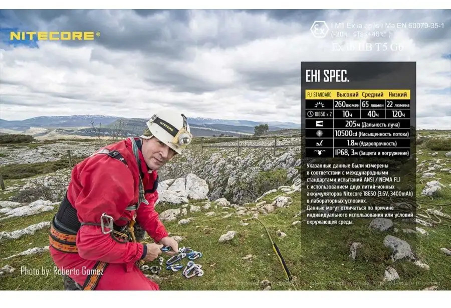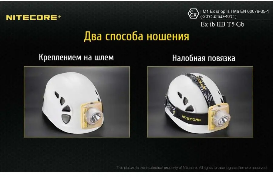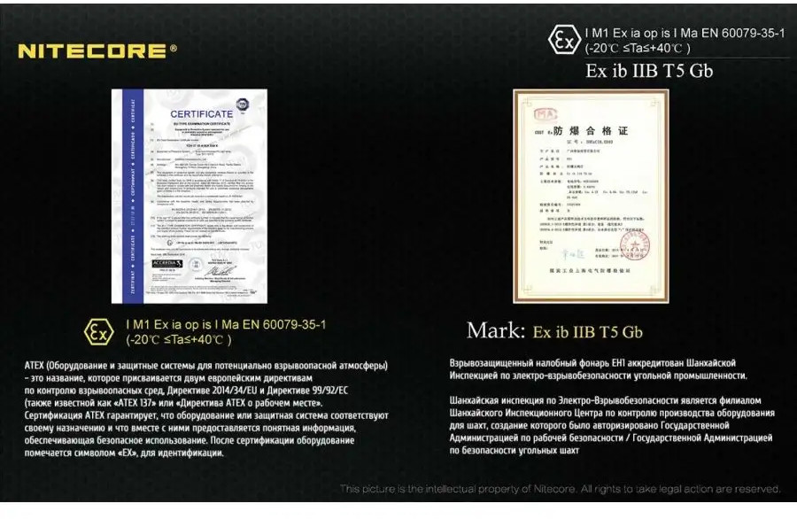 • Nitecore EH1 способен выдержать температуру окружающей среды до 100° C, что соответствует действующему температурному классу Т5;