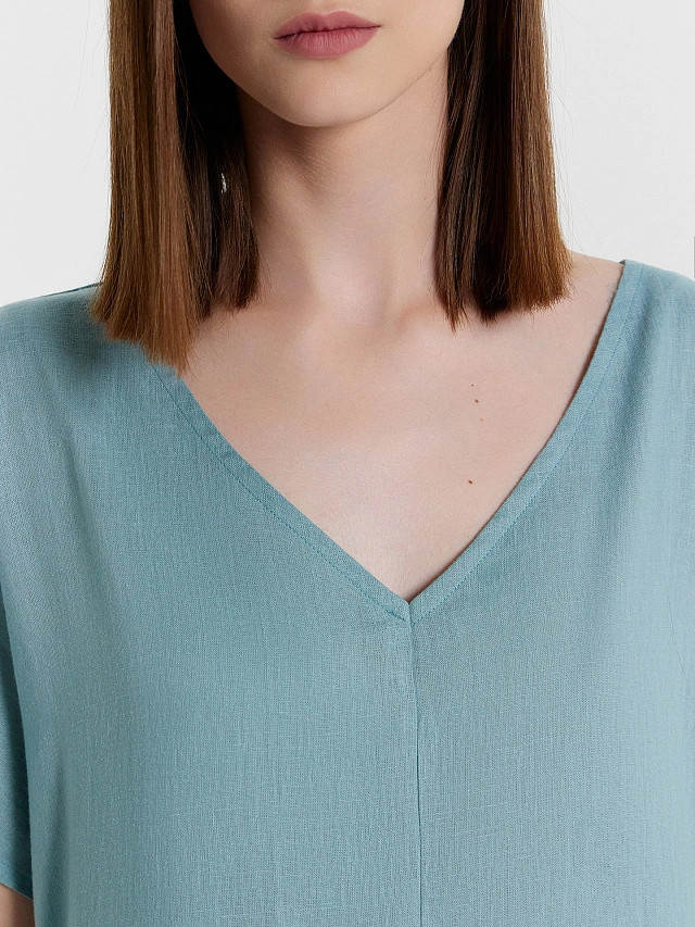 Обычно беру 48 или 50 размер. Взяла померить 46, так как больше размеров не было в наличии. Сел идеально (при фигуре, когда верх меньше, низ больше). Скрывает недостатки (животика не видно). Для льна не такая уж и плотная ткань. Покупке очень рада.