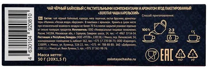 Золотая чаша Чай чёрный байховый с растительными компонентами пакетированный «Карельский»