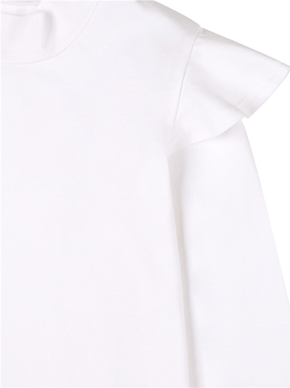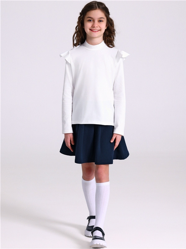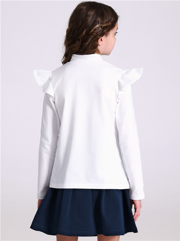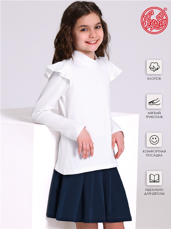 Водолазка для девочки выполнена из легкого хлопкового полотна с лайкрой. Изделие с длинными рукавами украшенными оборкой и воротником-стоечкой. Незаменимый предмет гардероба для юных школьниц!