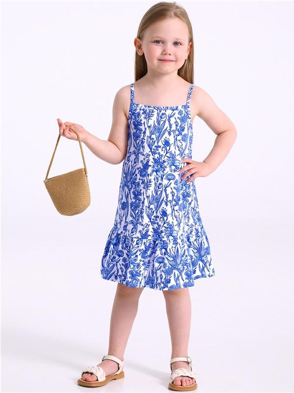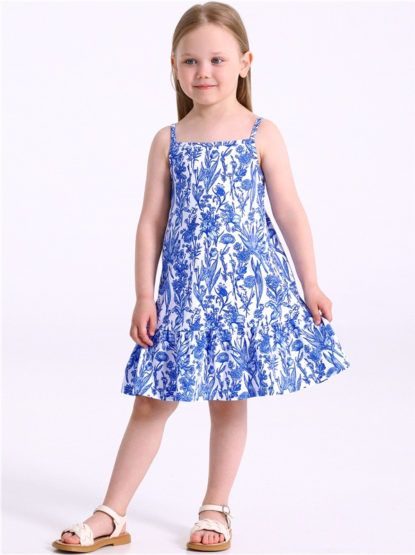 Сарафан для девочки выполнен из кулира — легкого хлопкового набивного полотна. Изделие трапециевидного силуэта, на тонких бретелях, с оборкой по низу.