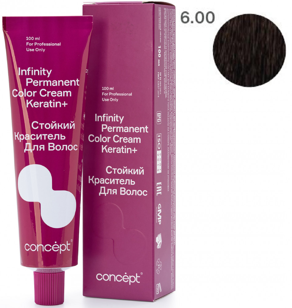 Стойкий краситель для волос Concept Infinity Permanent Color Cream Keratin+ — краситель, вдохновляющий создавать шедевры: 112 невероятно красивых оттенков. 9 новых направлений в палитре. Краситель, восстанавливающий структуру волос: синергия аммиачного компонента и аминоспиртов в формуле позволяют создавать стойкие интенсивные оттенки, уменьшая нагрузку на структуру волоса. Комплекс Keratin Infusion+ Shea butter эффективно застраивает пустоты в кортексе, не только возвращая волосу натуральную структуру, но и надежно фиксируя пигмент, питает и увлажняет волосы, обеспечивая силу и блеск. Это одновременное окрашивание и восстановление, возможное благодаря совместному действию кератина и масла ши, входящим в состав стойкого красителя.