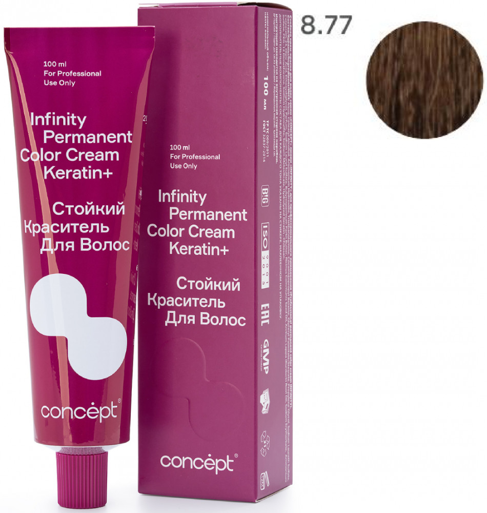 Стойкий краситель для волос Concept Infinity Permanent Color Cream Keratin+ — краситель, вдохновляющий создавать шедевры: 112 невероятно красивых оттенков. 9 новых направлений в палитре. Краситель, восстанавливающий структуру волос: синергия аммиачного компонента и аминоспиртов в формуле позволяют создавать стойкие интенсивные оттенки, уменьшая нагрузку на структуру волоса. Комплекс Keratin Infusion+ Shea butter эффективно застраивает пустоты в кортексе, не только возвращая волосу натуральную структуру, но и надежно фиксируя пигмент, питает и увлажняет волосы, обеспечивая силу и блеск. Это одновременное окрашивание и восстановление, возможное благодаря совместному действию кератина и масла ши, входящим в состав стойкого красителя.