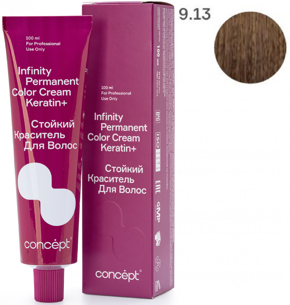 Краситель для волос стойкий «Permanent Color Cream Keratin+», оттенок 9.13 Светлый блондин пепельно-золотистый | Infinity | Concept