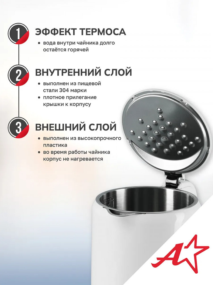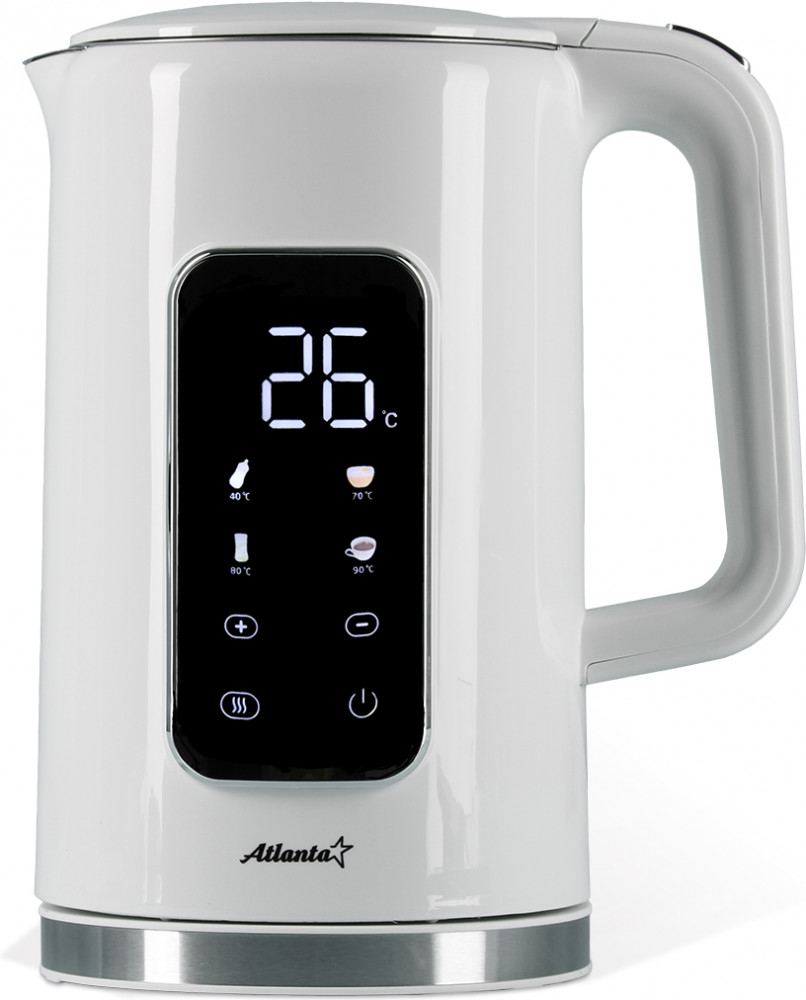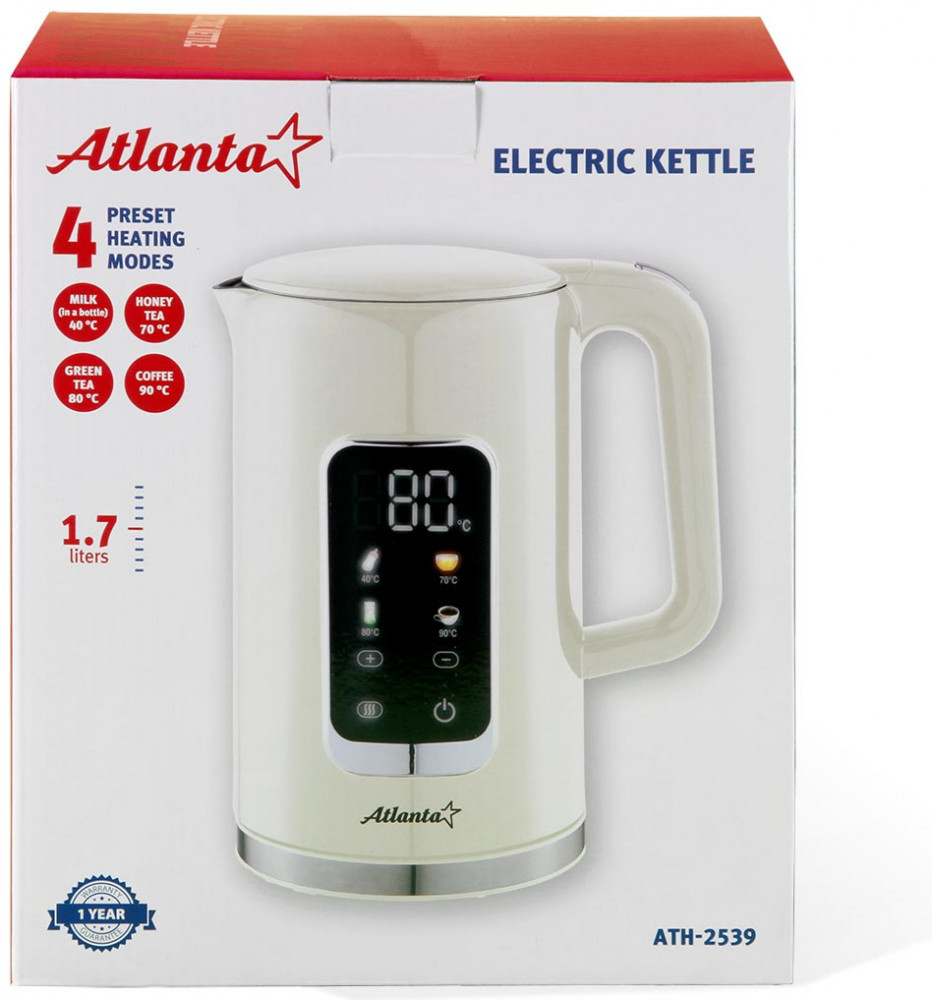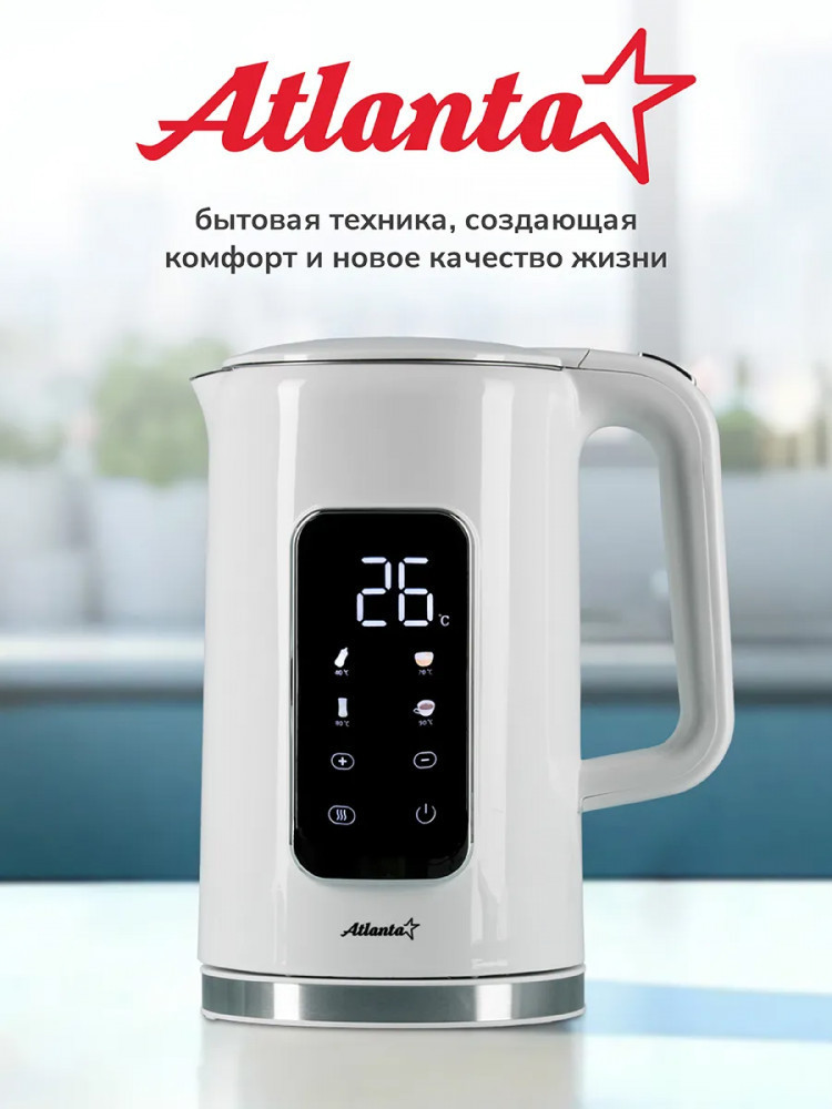 Электрический чайник ATH-2539 в белом цвете — это идеальное решение для тех, кто ценит качество и удобство в использовании. Эта модель обладает композитным двухслойным корпусом, обеспечивающим отличную теплоизоляцию и безопасное использование. Внутренняя колба выполнена из пищевой нержавеющей стали 18/10, что гарантирует безупречный вкус ваших напитков и долгий срок службы изделия. Одной из ключевых особенностей чайника является цифровой контроль температуры, который позволяет выбрать подходящий температурный режим для каждого вида чая или кофе. У вас есть возможность использовать четыре быстрых температурных режима, а также провести ручную настройку температуры, что делает его универсальным помощником на кухне.
