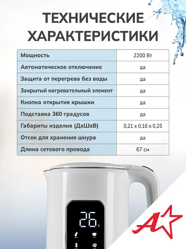 Большой и яркий LED дисплей обеспечивает удобство в использовании и позволяет легко следить за температурой воды. Управление чайником максимально простое и интуитивно понятное, благодаря чему он подходит как для опытных пользователей, так и для новичков. Эргономичный дизайн электрического чайника ATH-2539 позволяет удобно держать его в руках, а также легко наливать воду в кружку или чашку. Наслаждайтесь вашим любимым напитком с температурой, идеально подходящей для его приготовления. Этот чайник станет не только полезным прибором, но и стильным дополнением вашей кухни.